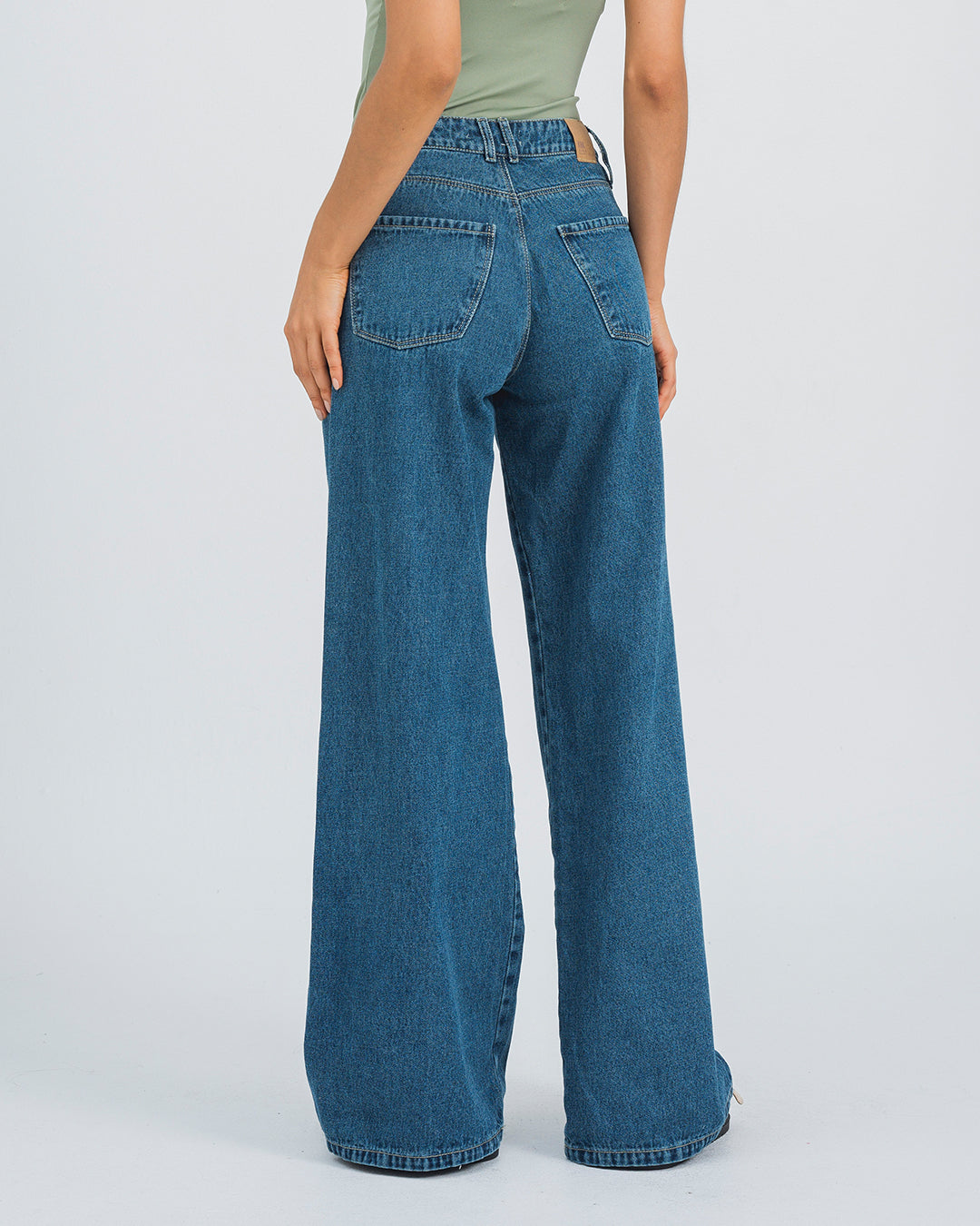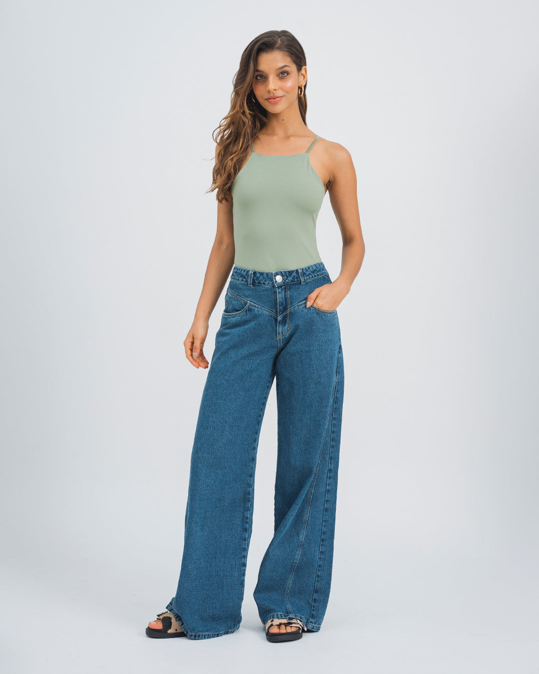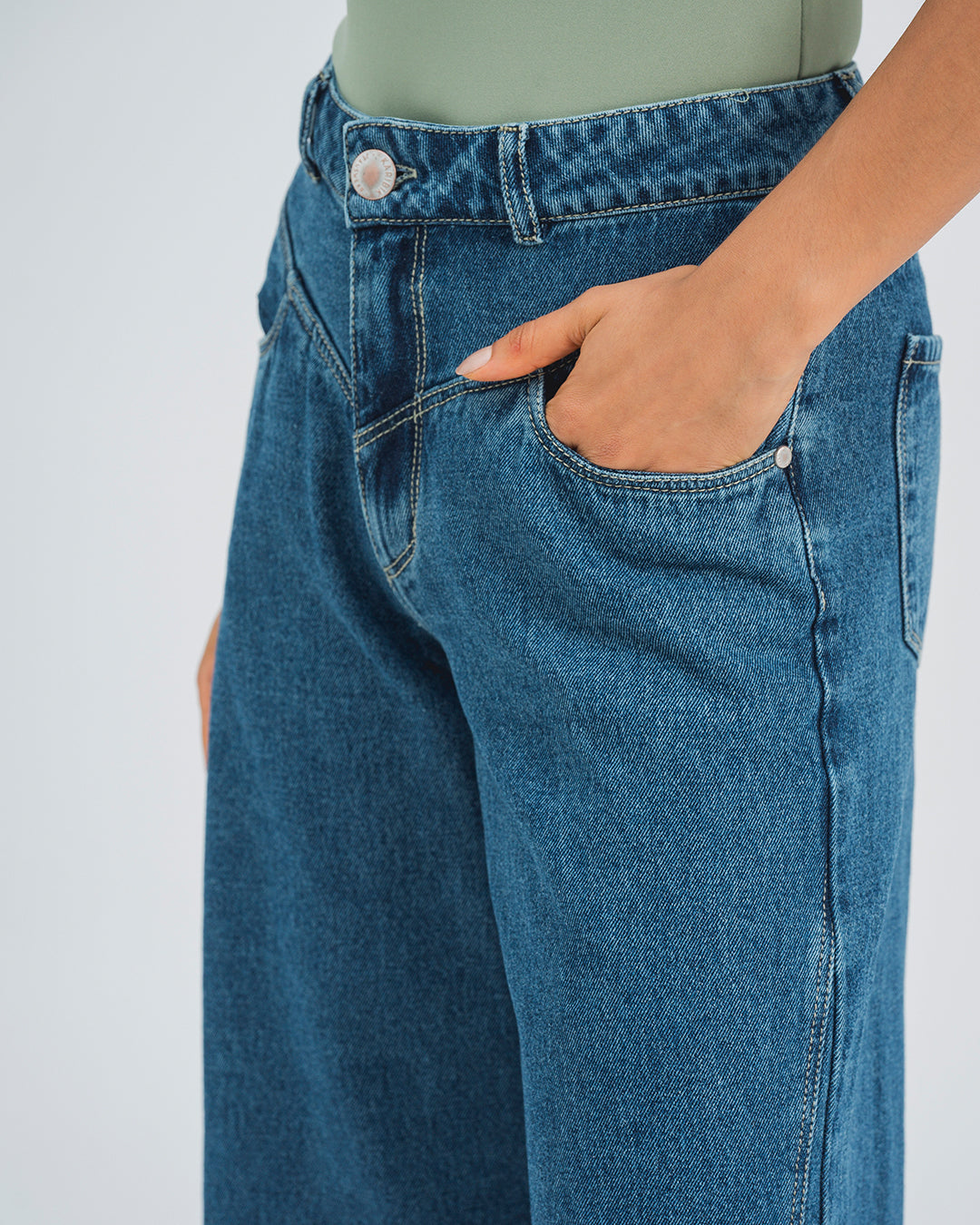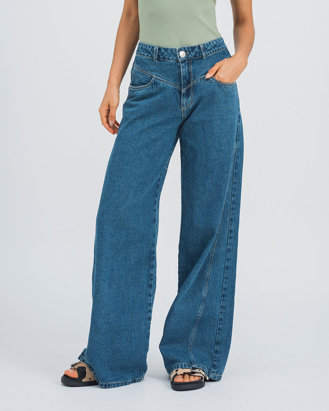 Jean wide leg en denim blue 100 algodón de talle alto Denim moda en Colombia Este jean casual de bota amplia está confeccionado en denim blue 100 algodón, lo que lo hace resistente, fresco y cómodo para el uso diario. Su proceso de lavandería en color azul medio le da un acabado moderno y fácil de combinar, ideal para quienes buscan una prenda versátil y en tendencia. Destaca por su corte en V en el frente y en los laterales, un detalle que añade estilo y originalidad a la silueta. Perfecto para el día a día, este jean se adapta a diferentes looks, desde los más relajados hasta los más sofisticados, convirtiéndose en un básico imprescindible dentro del denim moda en Colombia.