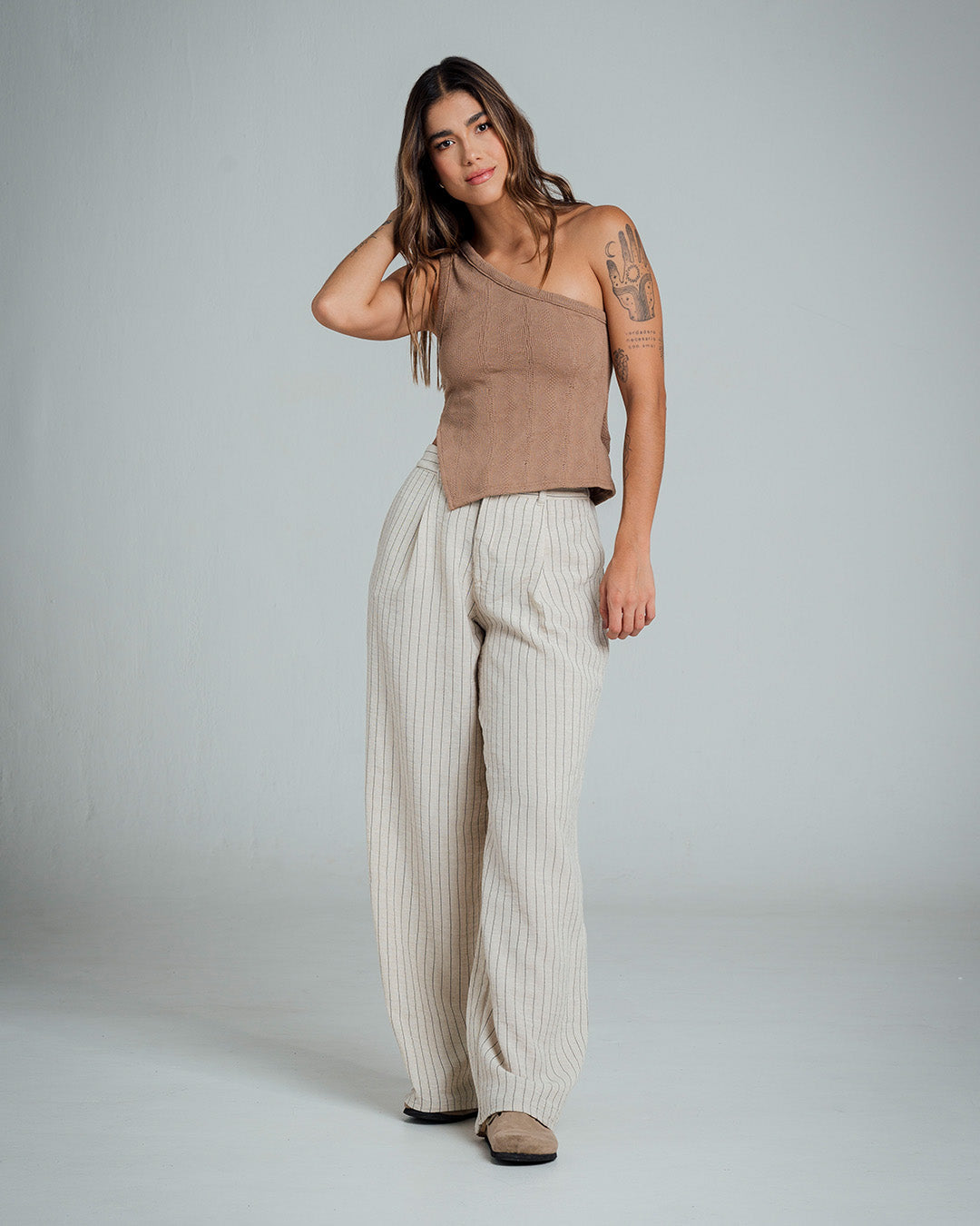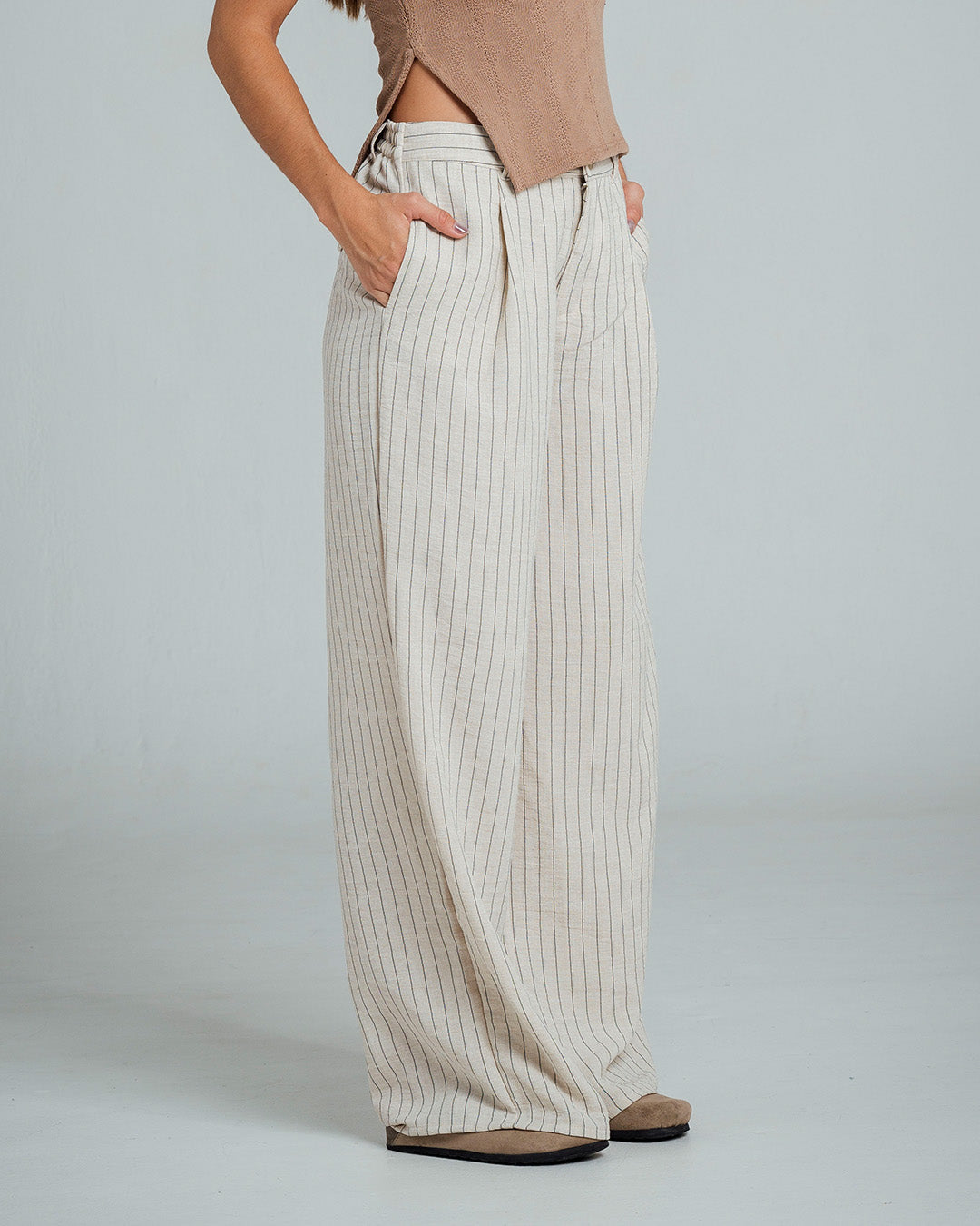 -Pantalón Talle Alto Tailoring -Silueta Semi Amplia -Elástico En Cintura Posterior -Bolsillo Ojal -Bota Recta -Tejido Plano A Rayas -Color ivory