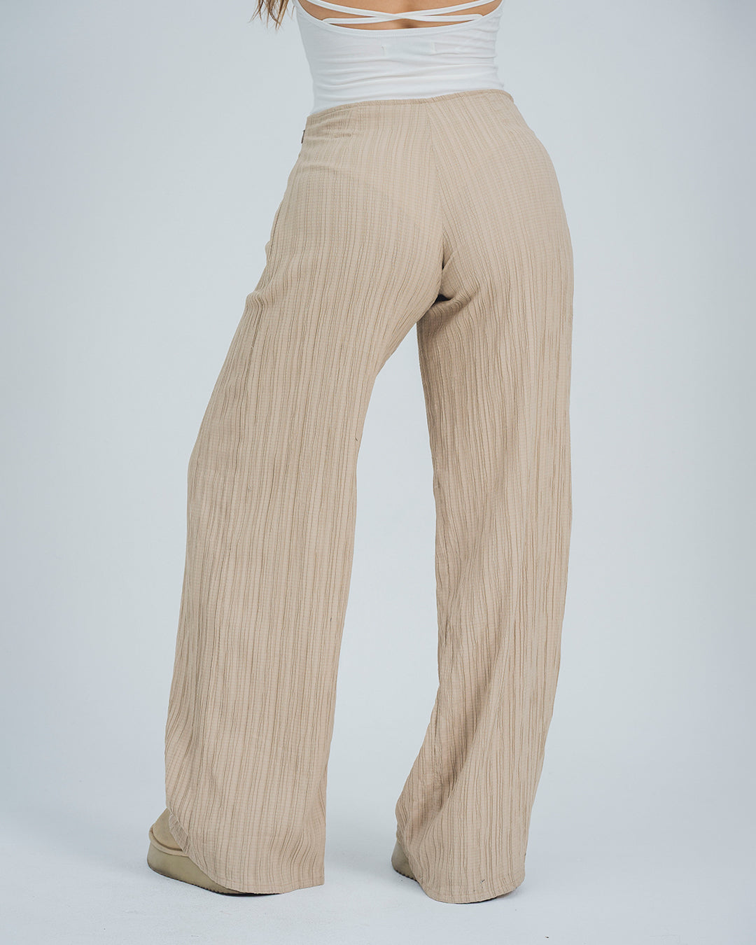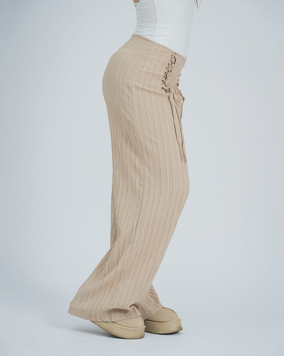 Pantalón talle medio, bota amplia, detalles de amarre en frente, con cierre en el costado, tejido con caída y textura, color café. La modelo usa talla 8.