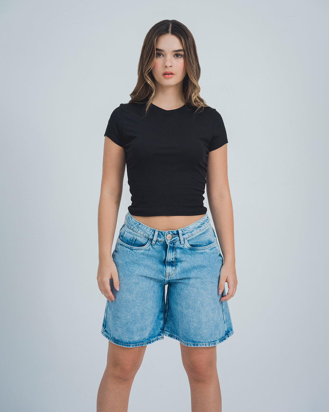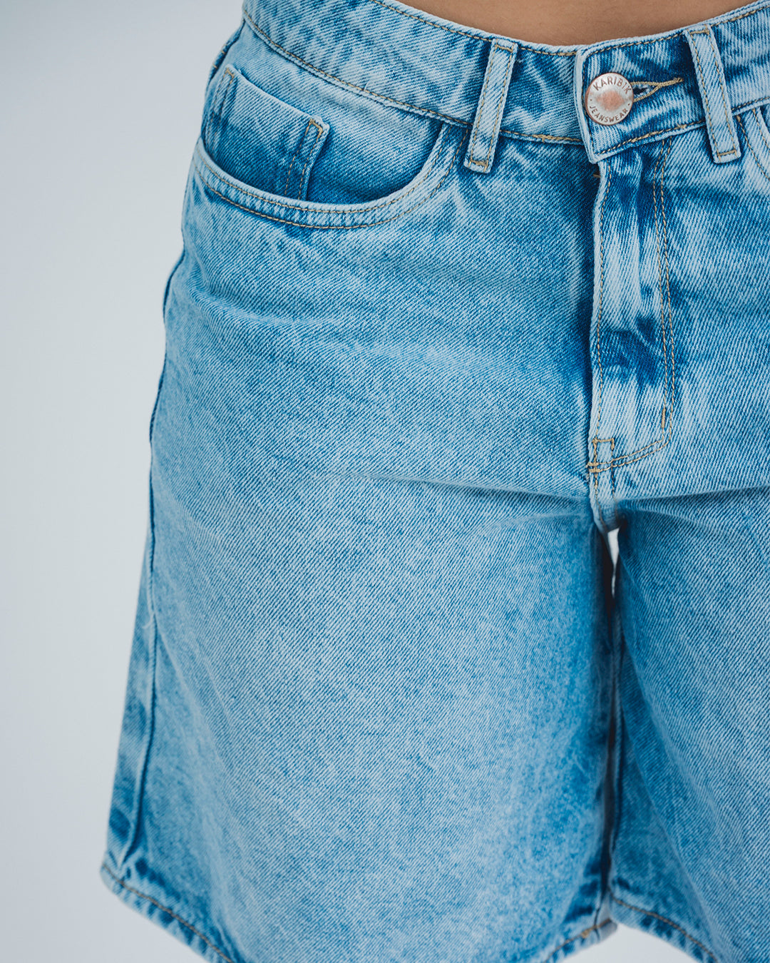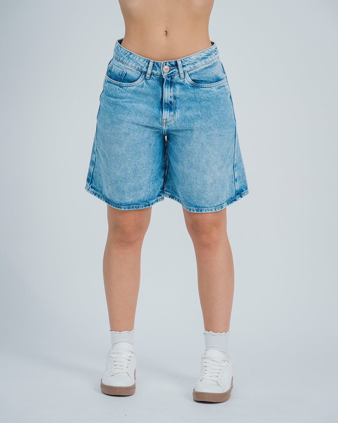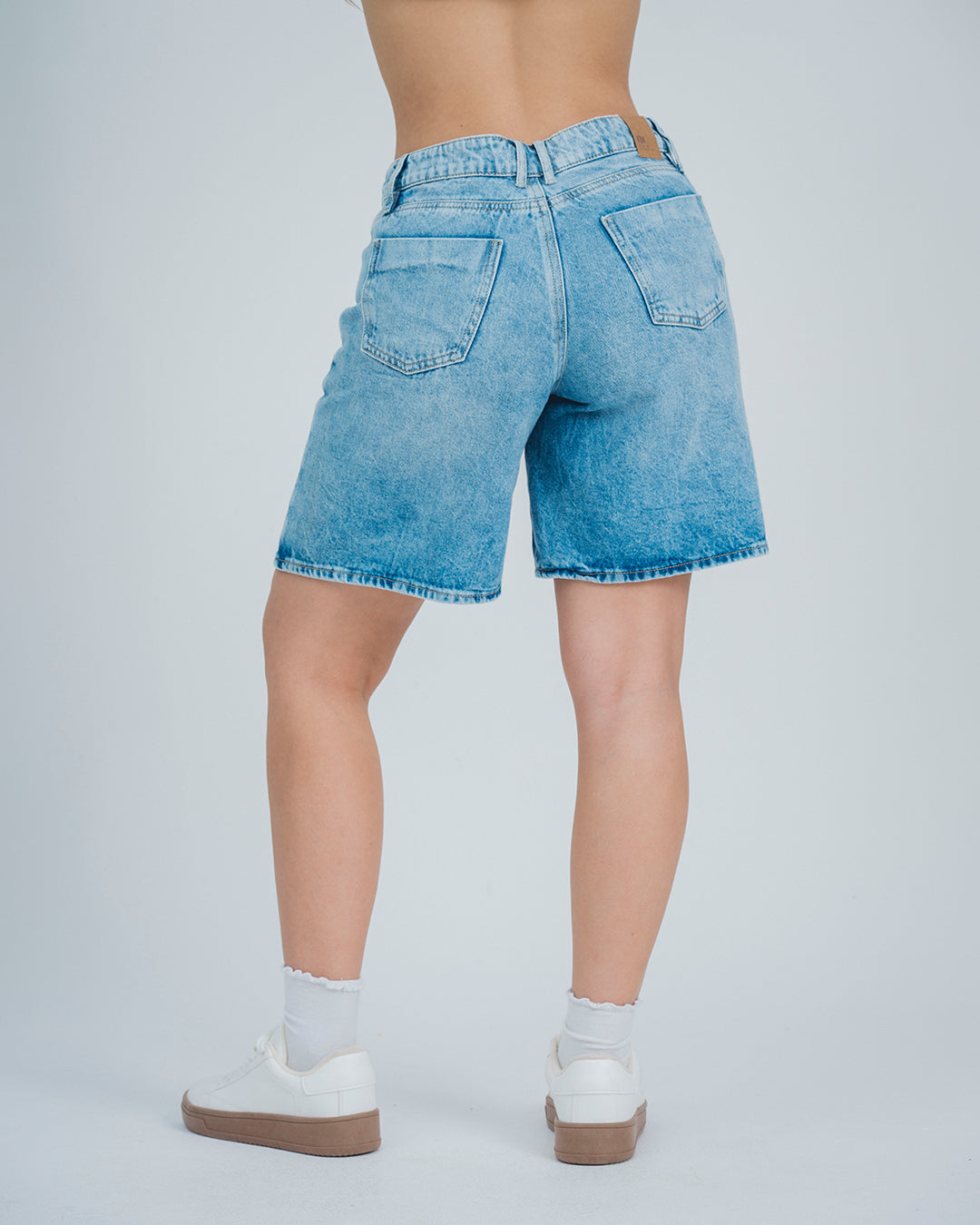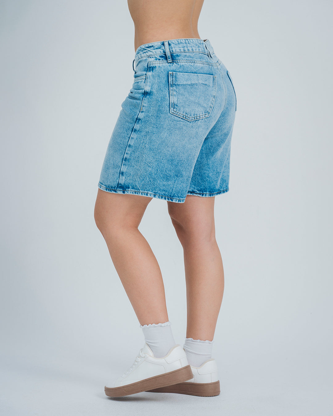 -Short momfit tipo bermuda -Talle medio -Con proceso de lavandería -Tejido plano