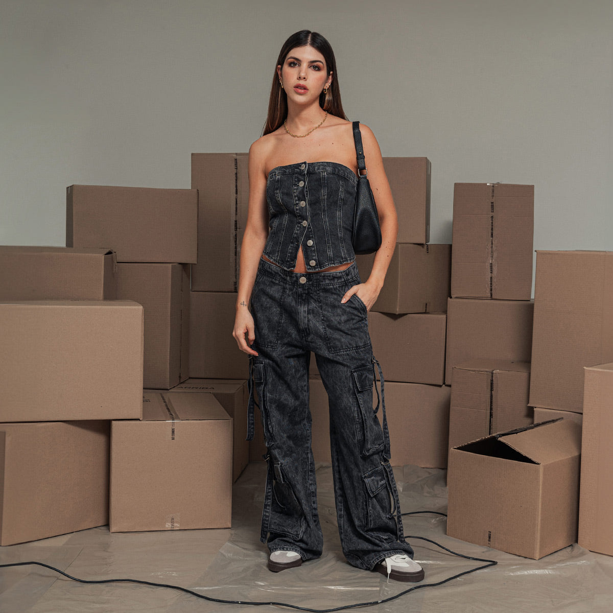 -Corset Strapless -Silueta Ajustada -Largo Medio -Cortes En Frente Y Espalda -Botones En Frente -Black Denim Con Proceso En Lavandería