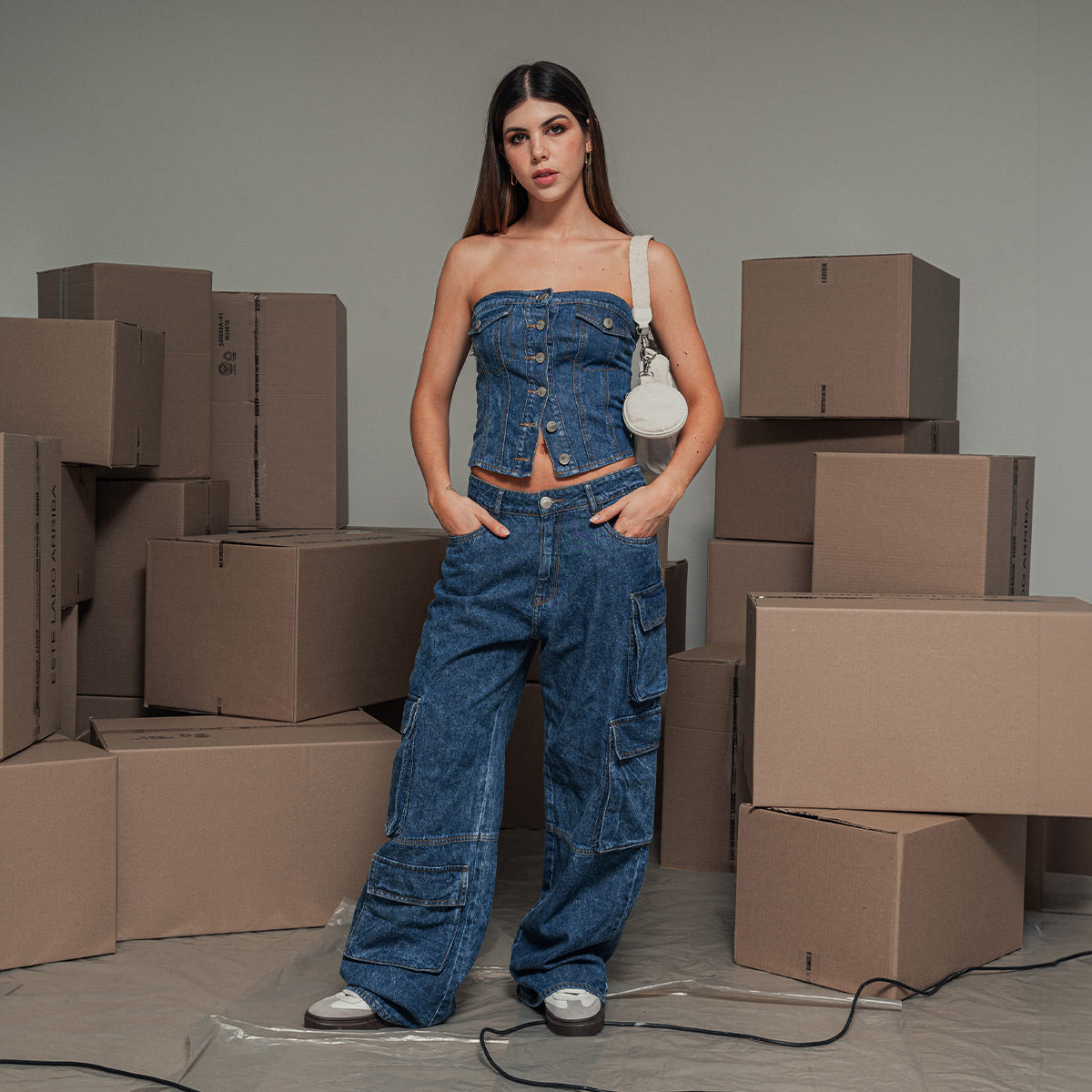 -Blusa strapless -Silueta ajustada -Largo medio -Frente con perilla y botones -Tapas de bolsillo decorativa -Corte en frente -Tejido de plano 100 algodón -Tono medio-oscuro