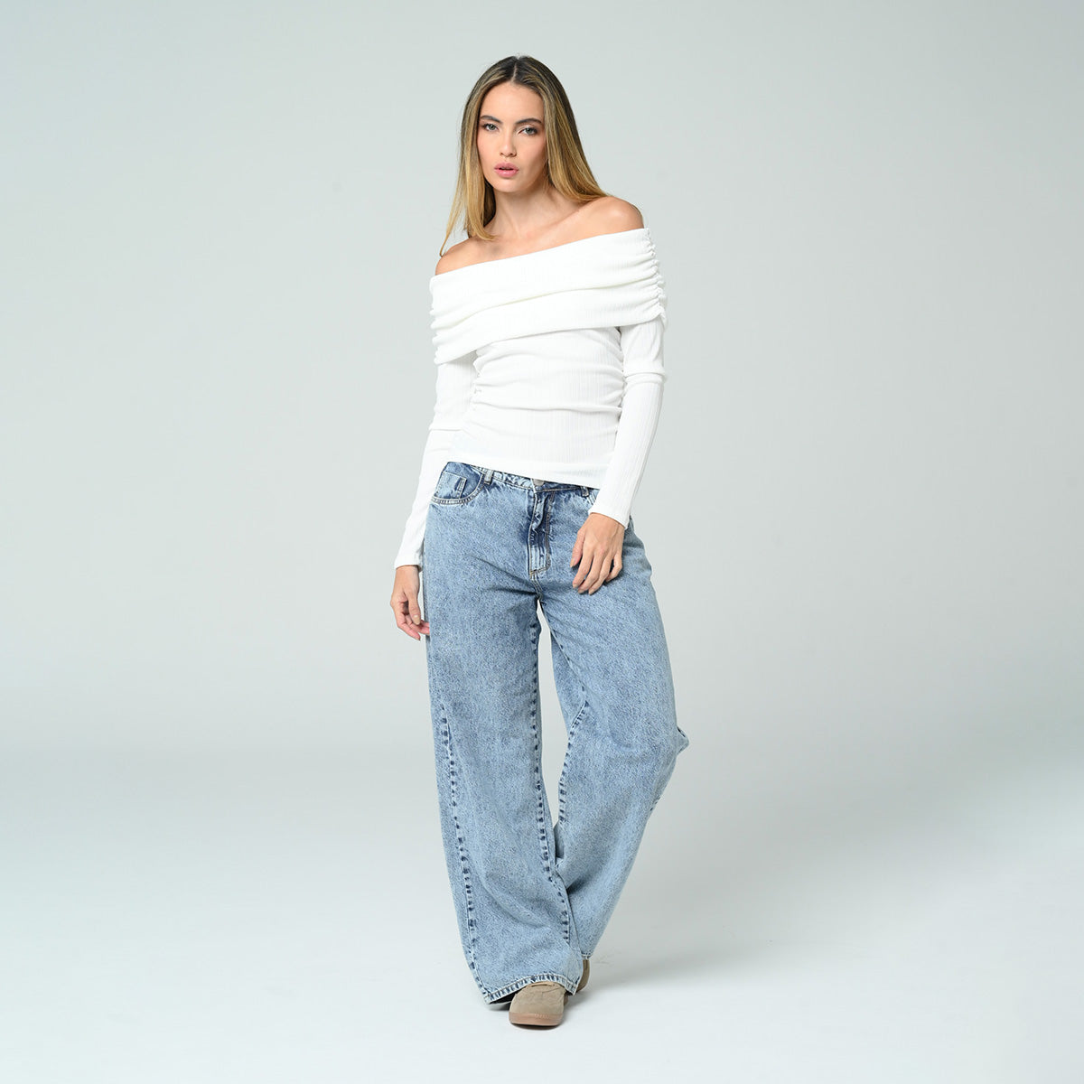 -Blusa Manga Larga Con Solapa -Silueta Ajustada -Largo Medio -Tejido De Punto Rib -Color ivory