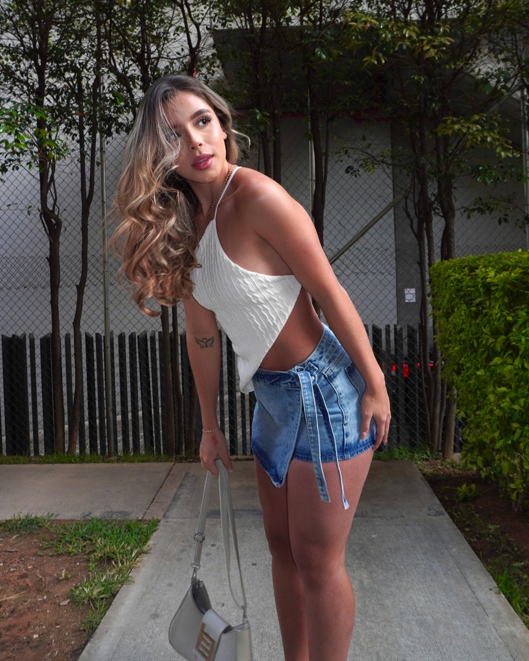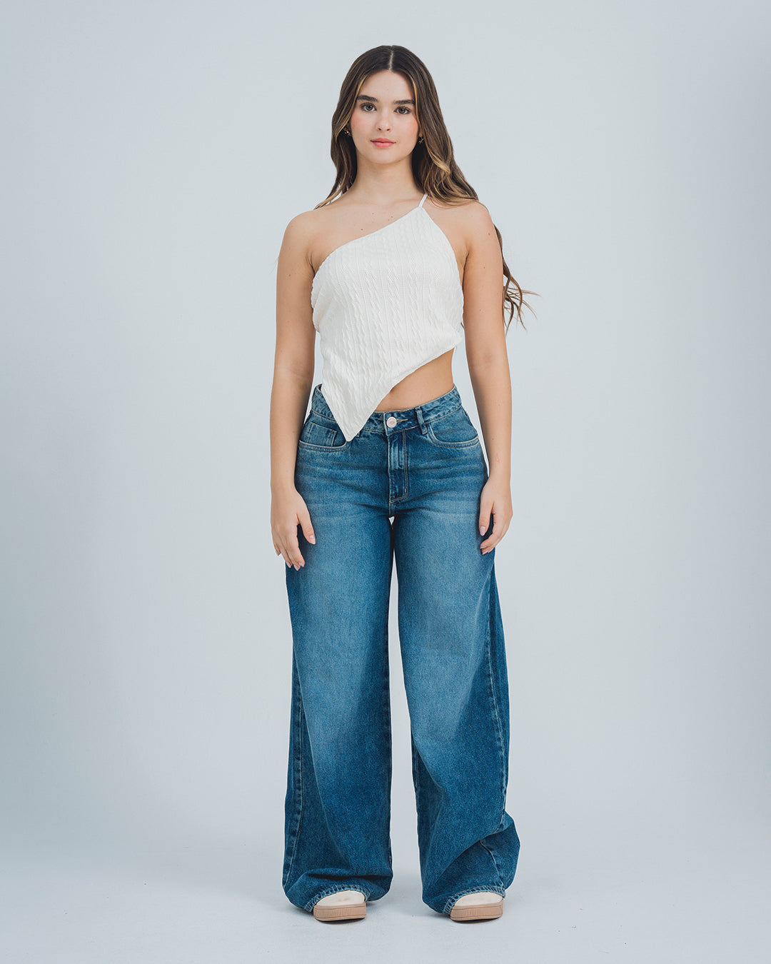 Blusa ajustada a un solo hombro con corte asimétrico y espada descubierta con amarre en tejido de punto tipo lanilla con forro en frente, color marfil
