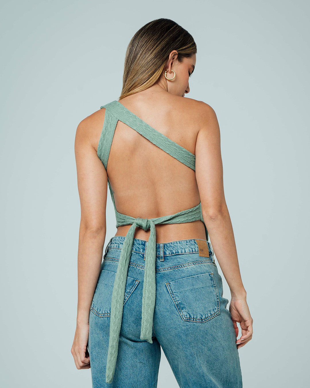 -blusa a un solo hombro -silueta ajustada -espalda descubierta con amarre -ruedo asimétrico en pico -tejido de punto tipo lanilla -color verde