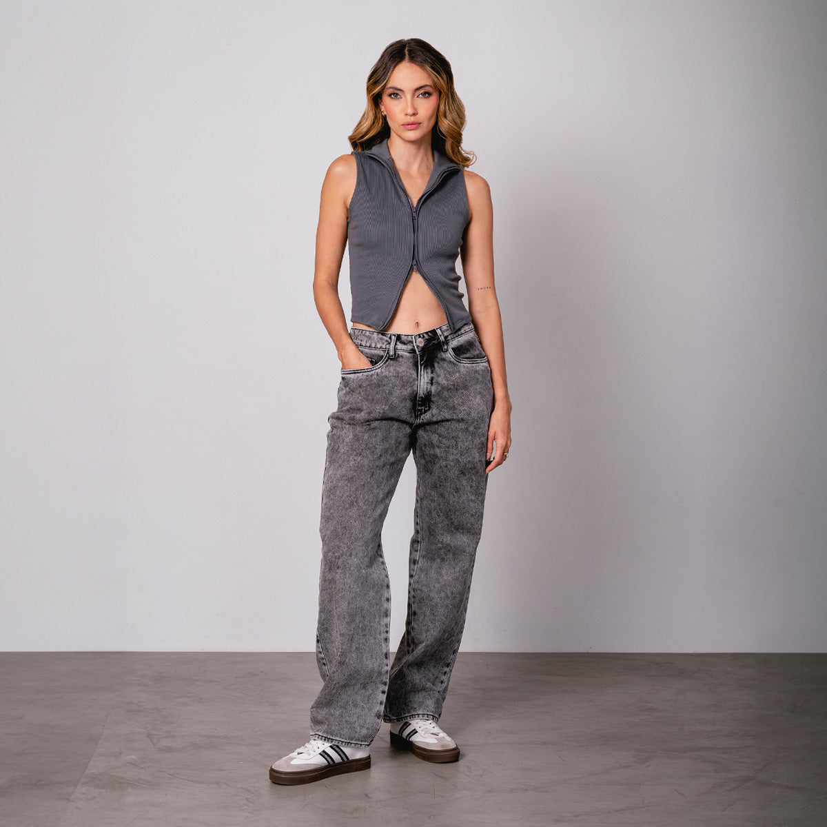 -Blusa Manga Sisa -Silueta Ajustada -Largo Medio -Cuello Alto -Cierre Doble En Frente -Tejido De Punto -Color Gris