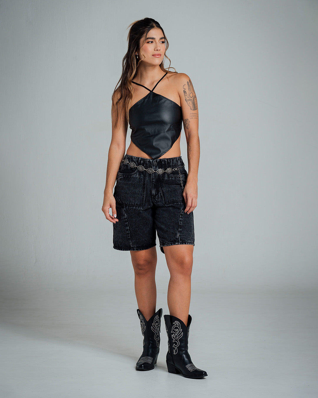 Blusa de tiras efecto cuero, con anudado en la espalda, color negro, ideal para salidas nocturnas o fiestas.