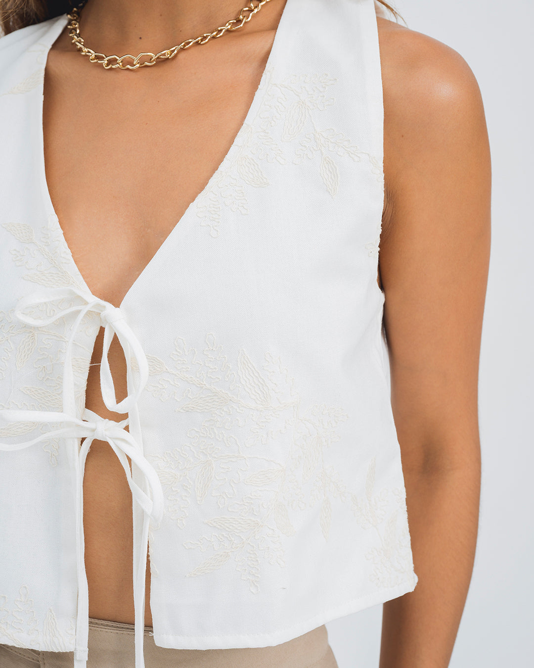 Blusa en poliéster y algodón con un estilo casual y Boho. En color marfil, con escote en V, manga sisa, silueta semi amplia y frente con amarre y delicado bordado. Esta prenda transmite frescura, sofisticación y versatilidad, ideal para salir con amigas con un toque femenino y actual.
