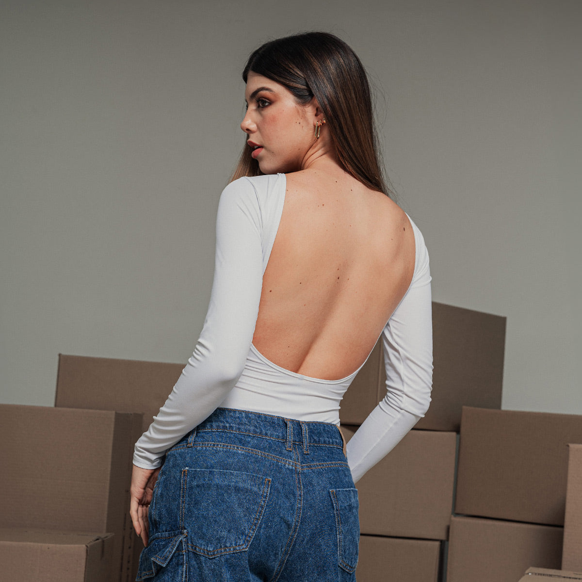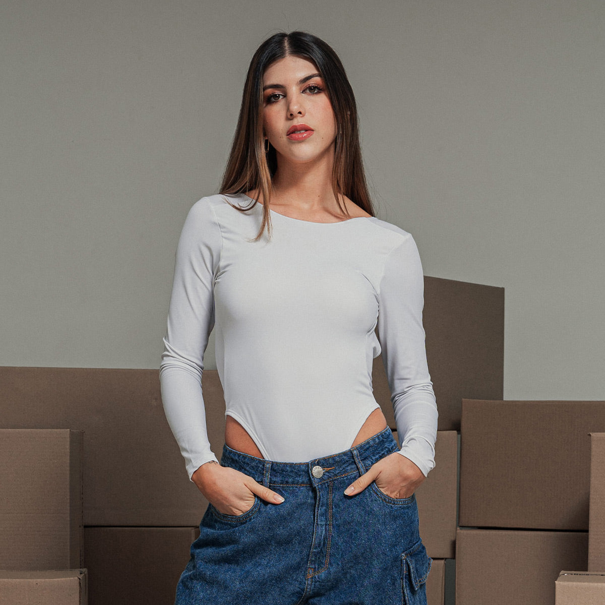 -Body manga larga -Silueta ajustada -Escote profundo en espalda -Talle alto -Tejido de punto con elongacion -Color blanco