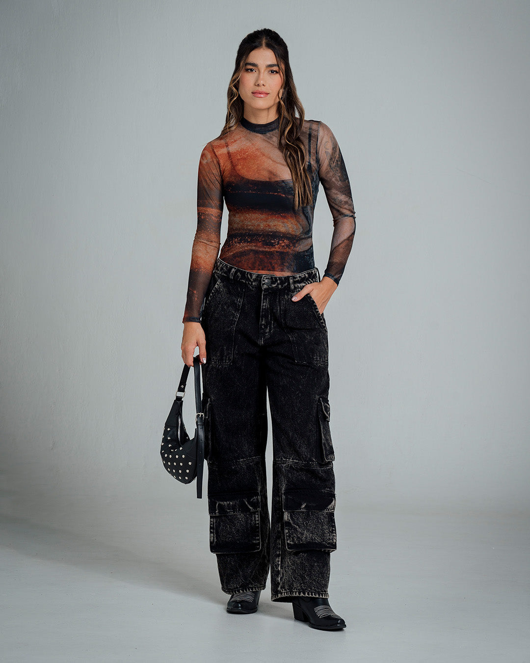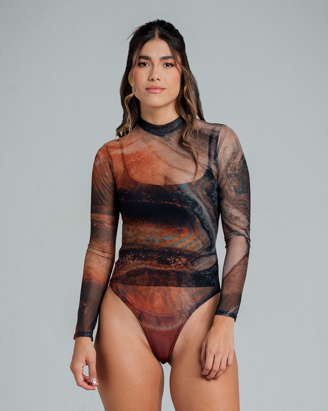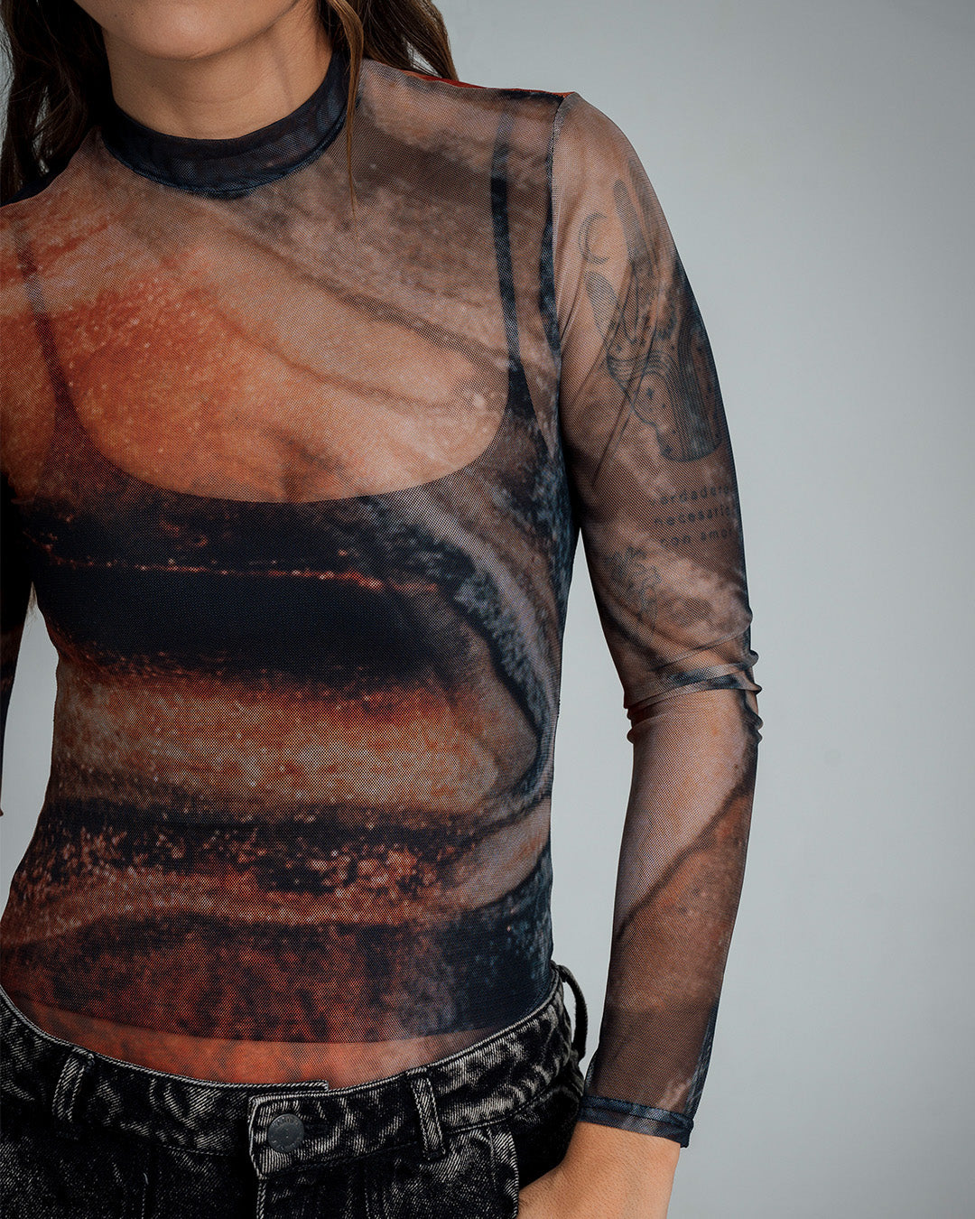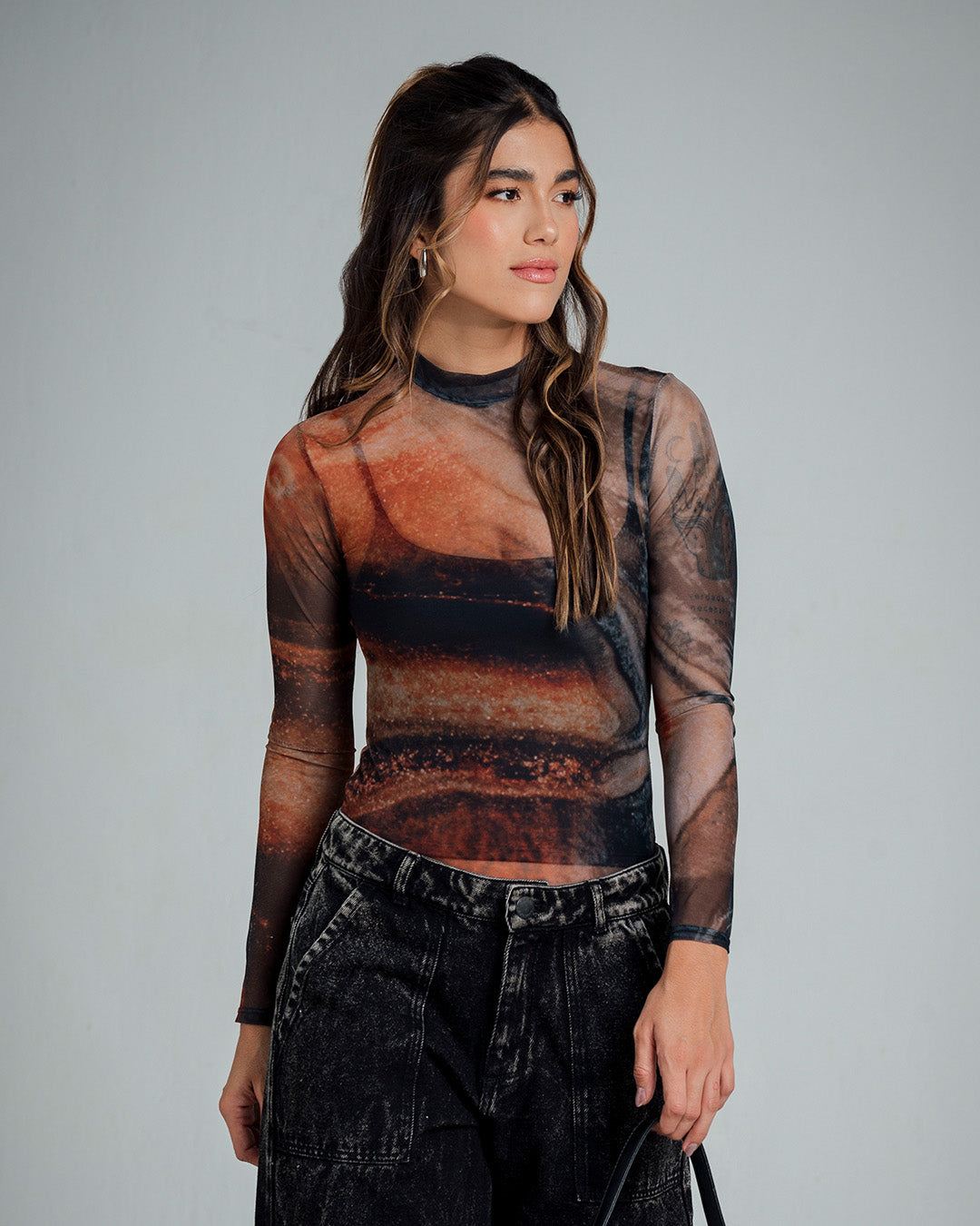 Body tiro bajo ajustado manga larga, cuello alto, elaborado en tejido de punto mesh, tacto suave, estampado en degrade con colores oscuros. La modelo usa talla s.