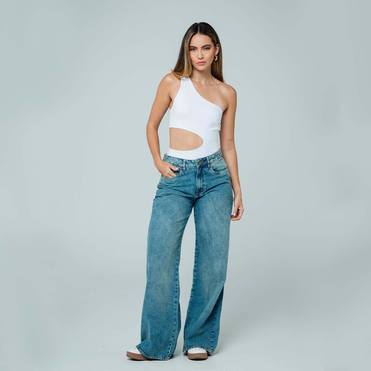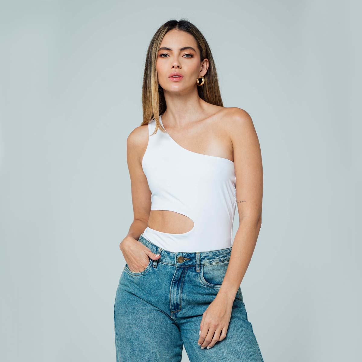 Body con escote asimétrico y abertura en cintura, elaborado en tela deportiva con elongación, color marfil. La modelo usa talla s.