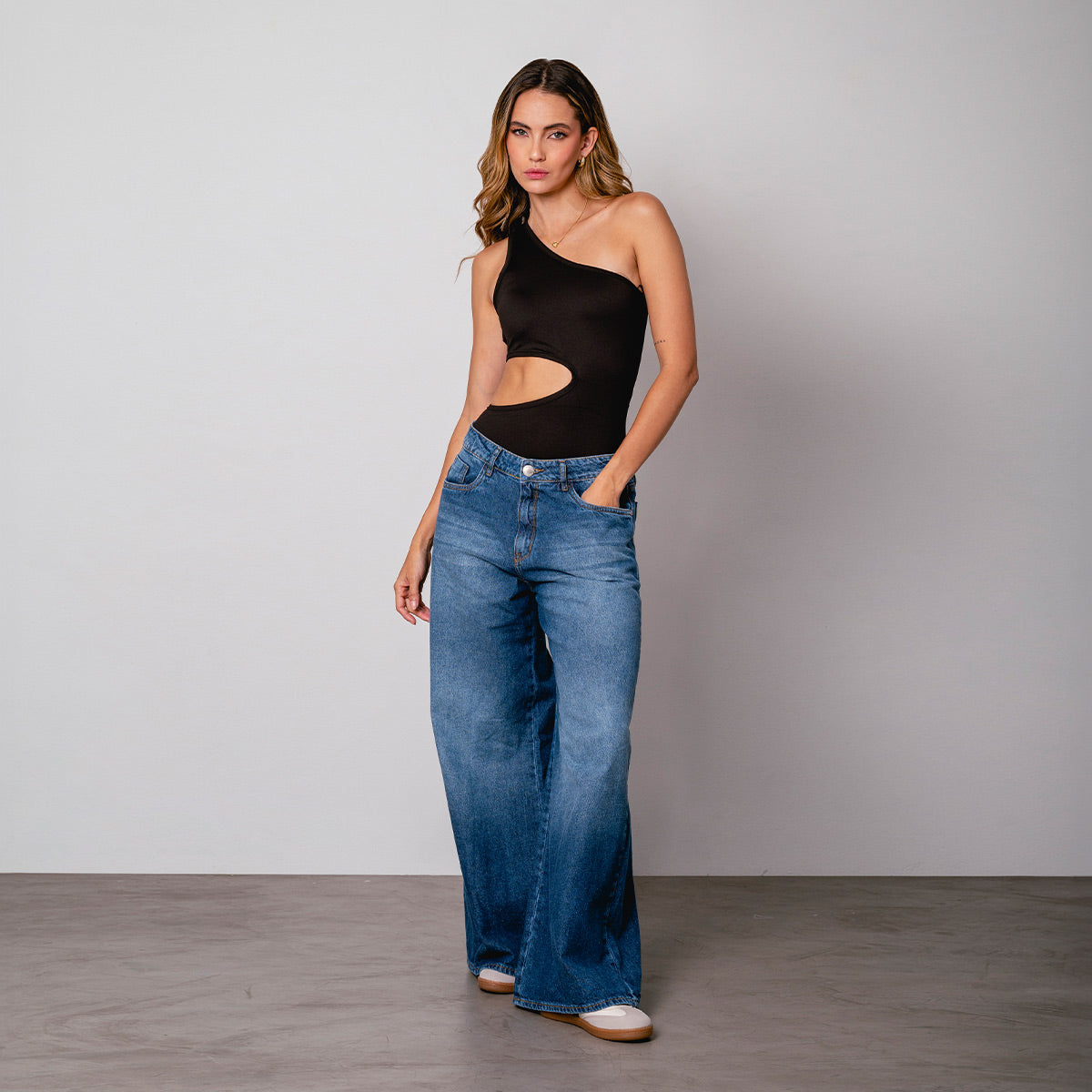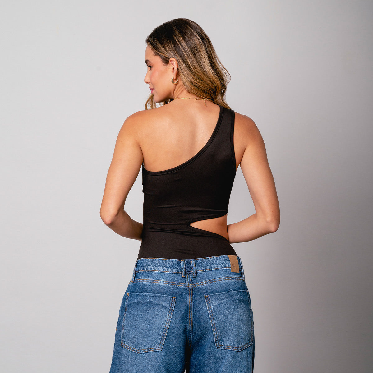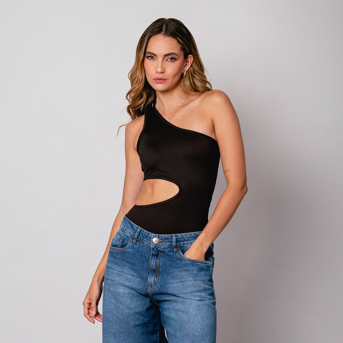 -Body a un solo hombro -silueta ajustada -abertura en costados -escote y abertura -tejido de punto con elongación -Color negro