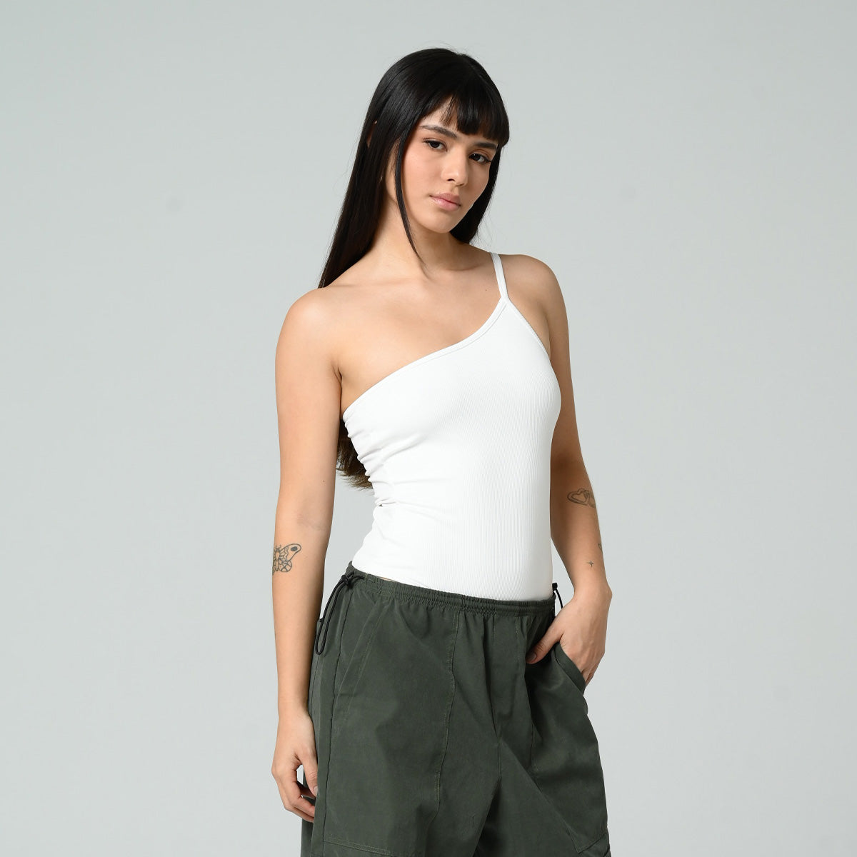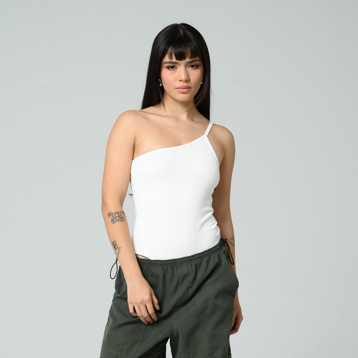 -Body a un solo hombro -Silueta ajustada -tejido de punto rib -Color Ivory