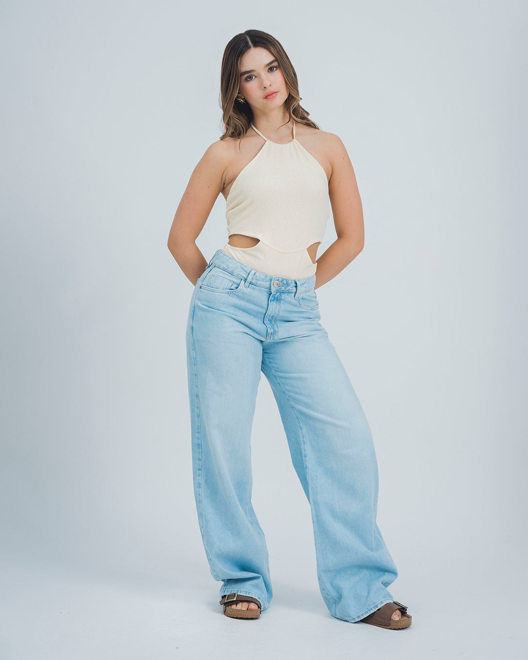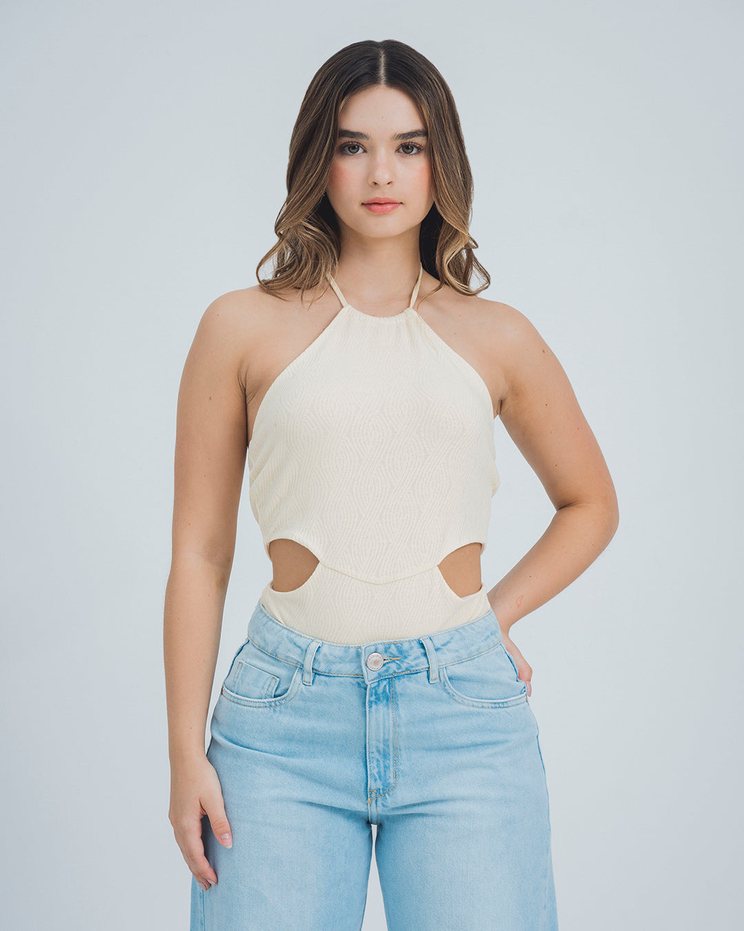 Body escote alto con amarre en cuello, abertura en costados, tejido con elongación y textura, color amarillo. La modelo usa talla s.