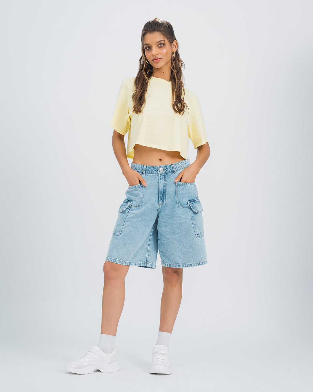 Camiseta amplia corta confeccionada en algodón, perfecta para un look casual y relajado. En un suave tono amarillo claro, cuenta con cuello redondo y manga corta que aportan frescura y comodidad. Su diseño incluye estampado en el frente y la espalda, lo que añade un toque moderno y versátil. Gracias a su material liviano, brinda una sensación de frescura ideal para el día a día, convirtiéndose en un básico de tu armario que combina con todo y nunca pasa de moda.