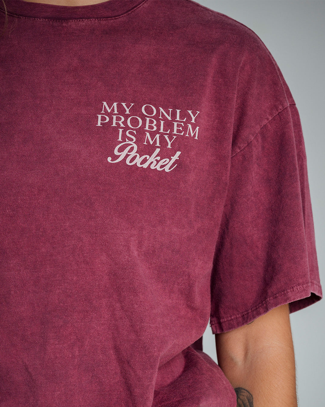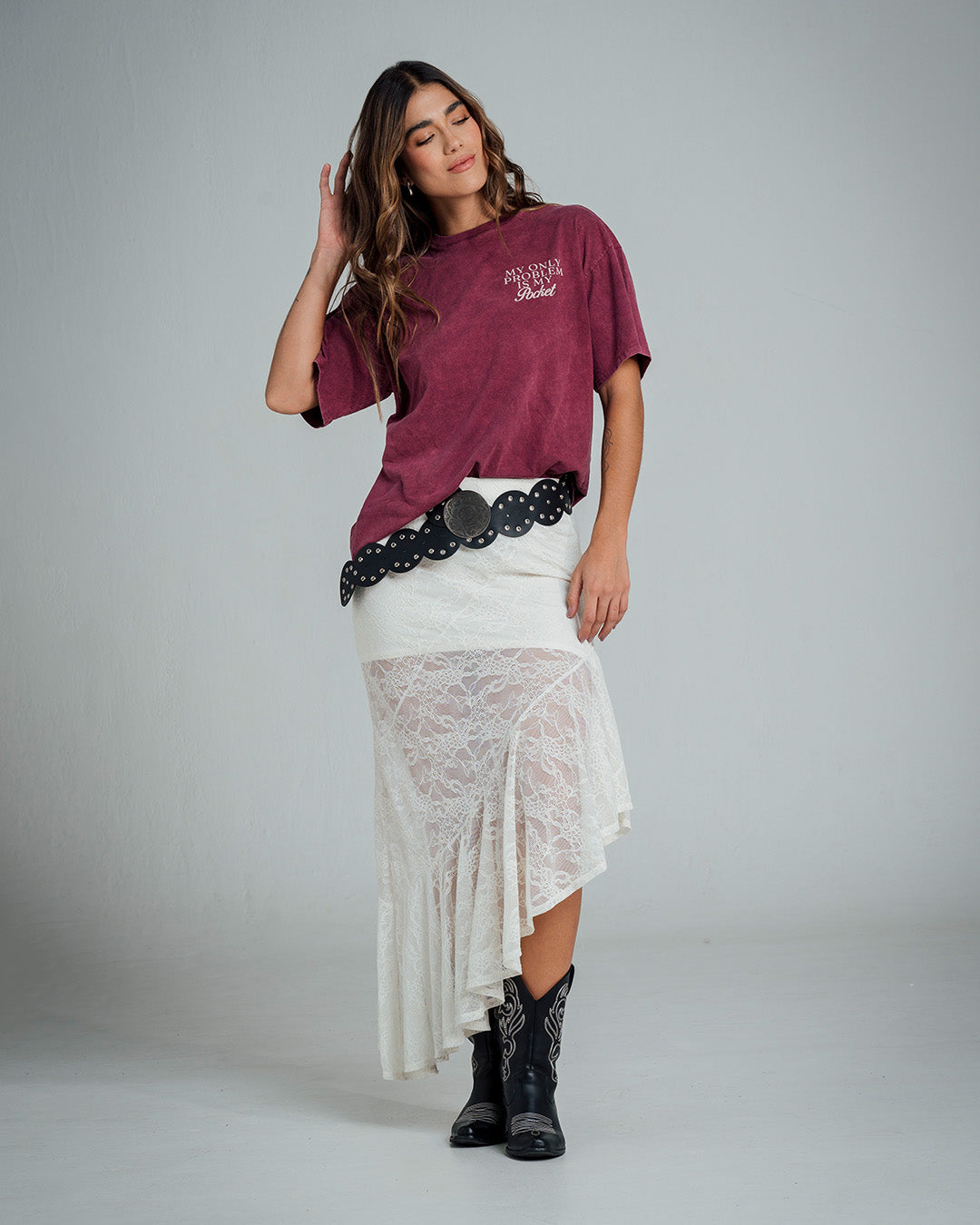 Camiseta oversized lavada con estampado tipográfico en frente y espalda, color vino, la modelo usa talla S