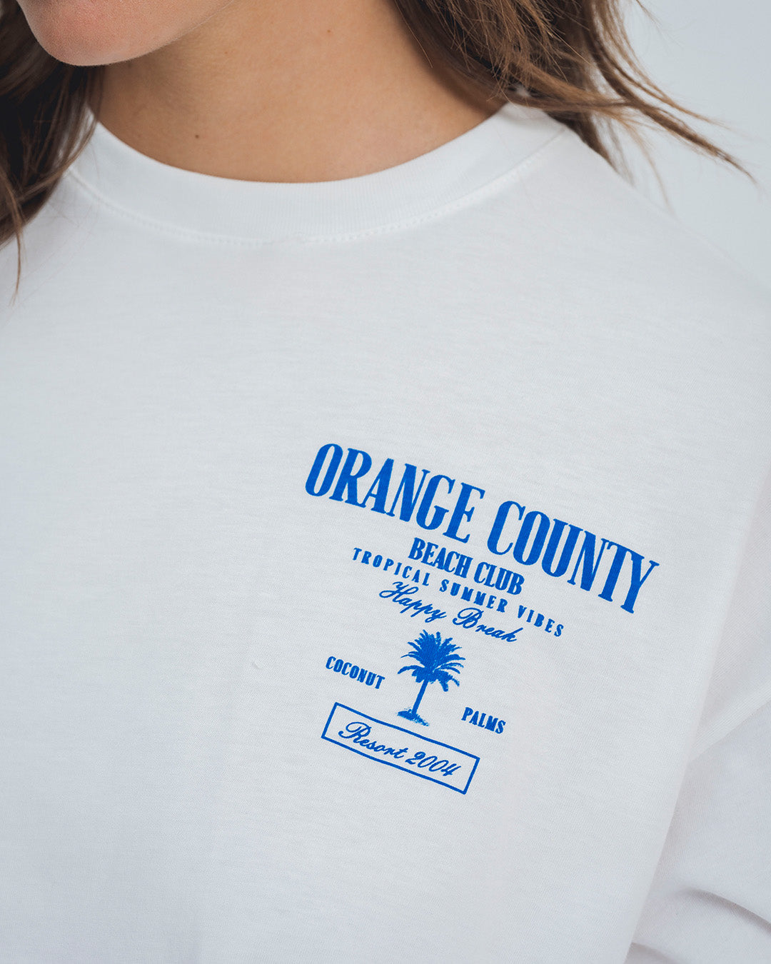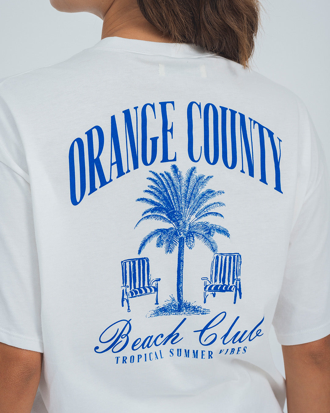 Camiseta oversized con cuello en rib, estampada en frente y espalda en algodón Estampado en frente y posterior color marfil. La modelo usa talla s.