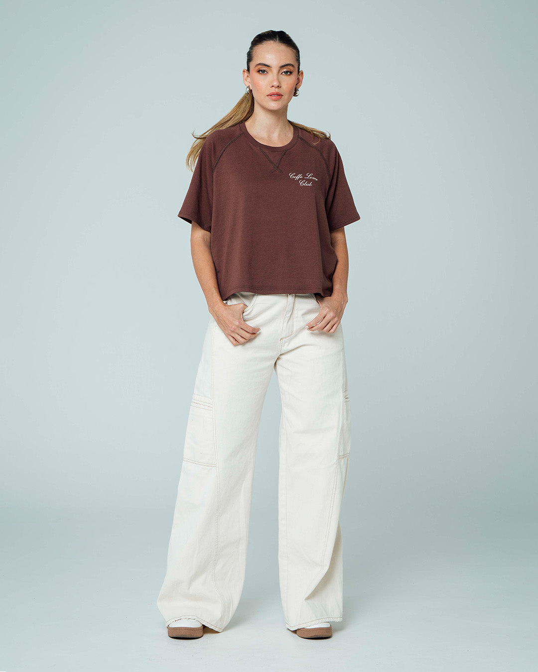 -Camiseta Manga Ranglán -Silueta Semi Amplia -Largo Medio - Estampado En Frente Tipográfico -Color Café