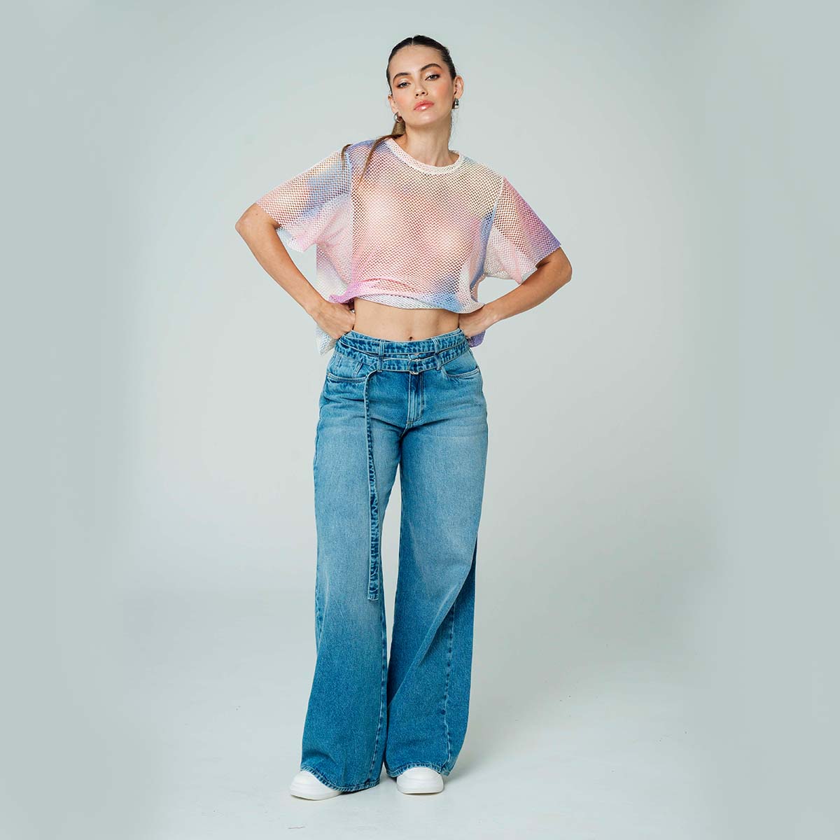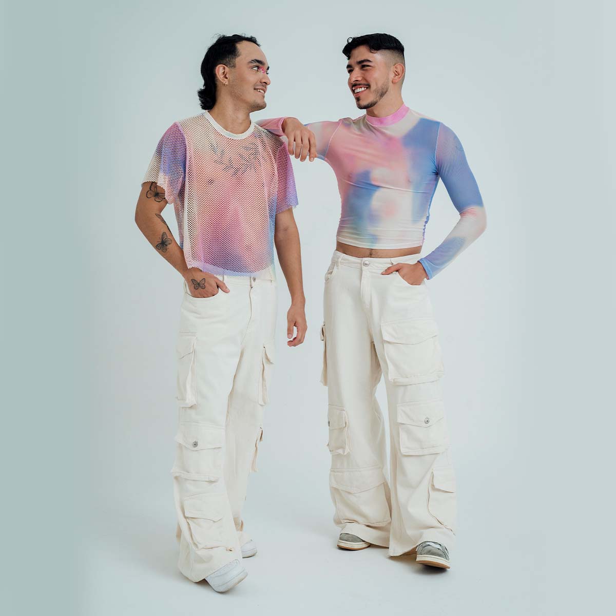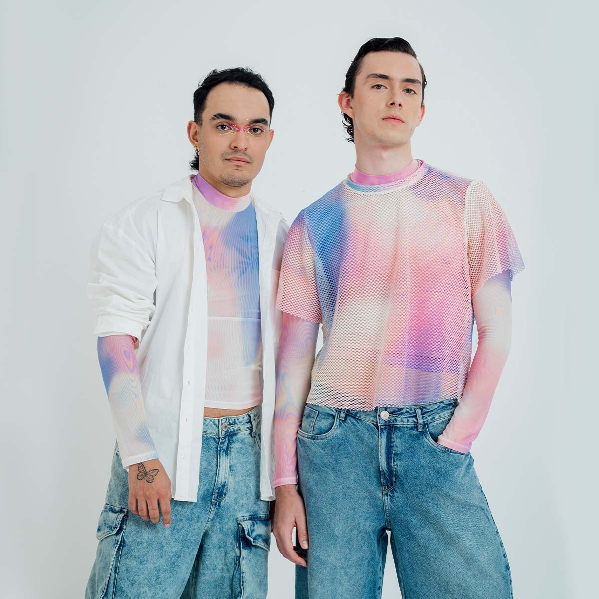 -Camiseta manga corta -silueta boxy -tejido de punto malla sublimada con diseño pride -multicolor