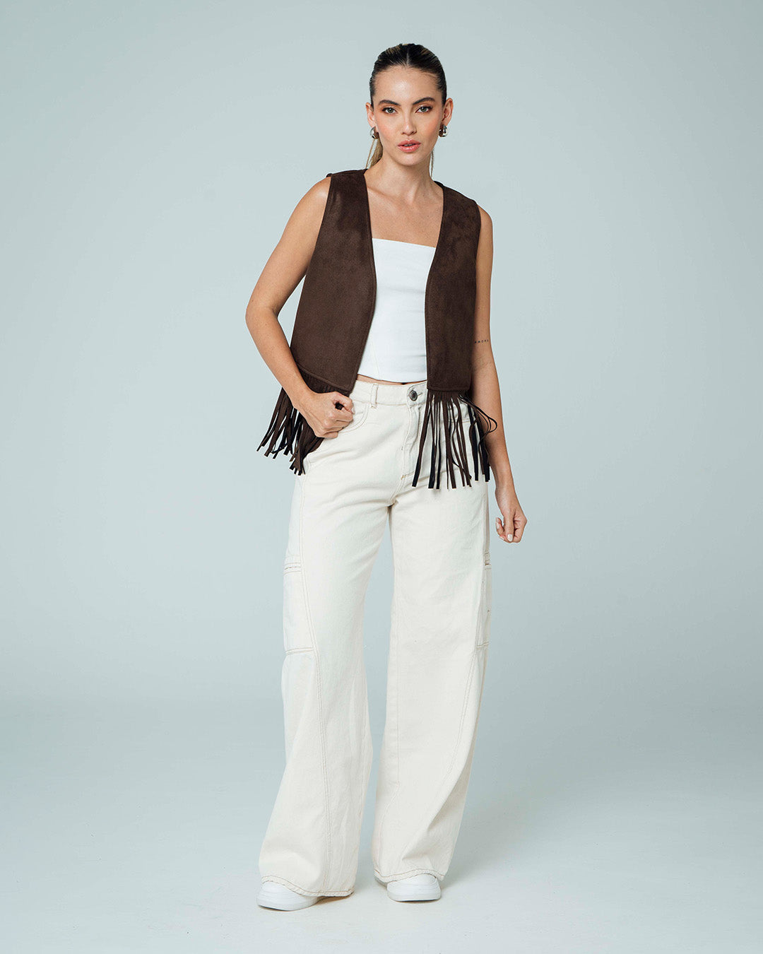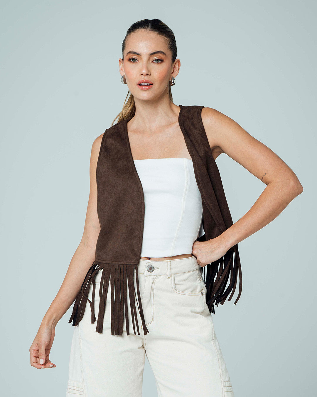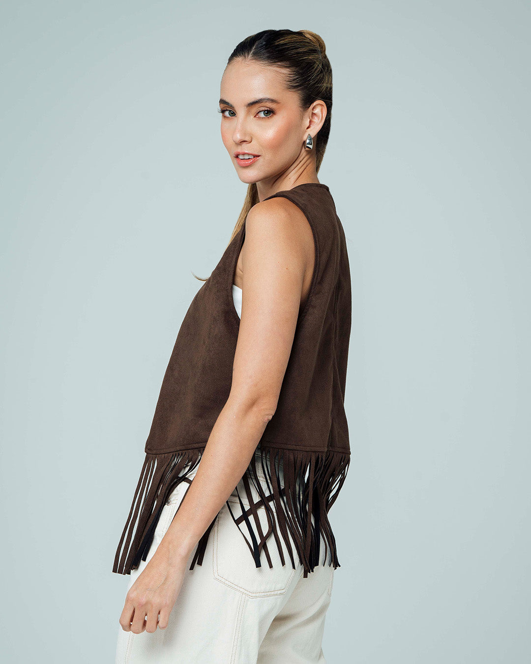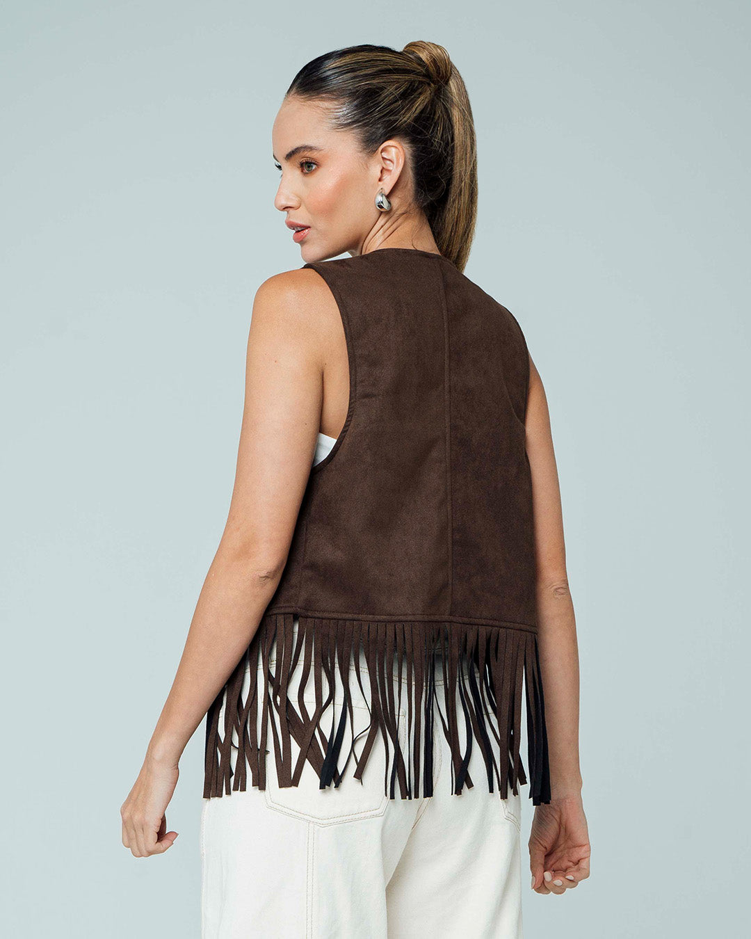 -Chaleco con Flecos -Silueta Semi Amplia -Largo Medio -Tejido De Punto Suede -Color Café