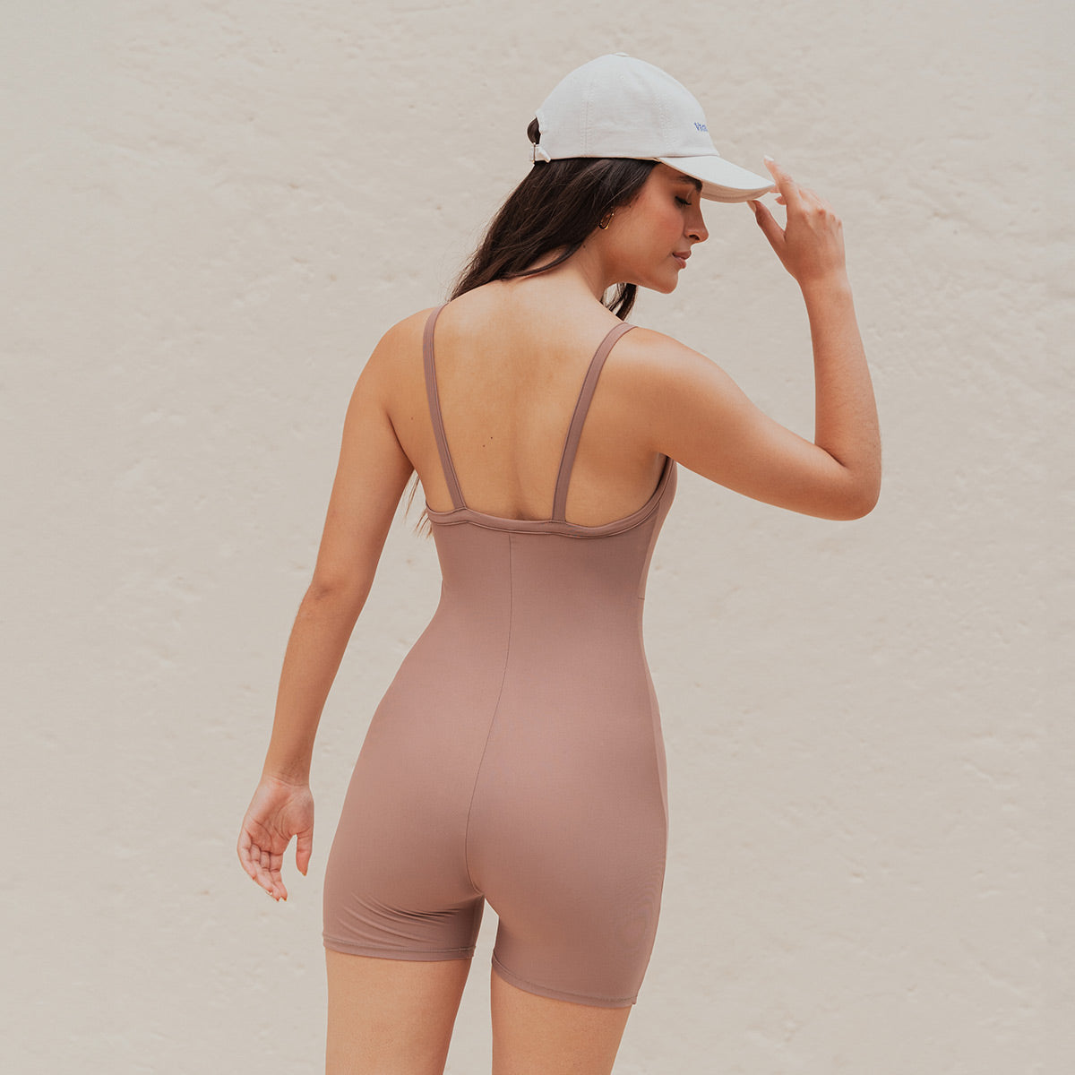 -Enterizo deportivo de tiras -silueta ajustada -escote redondo -espalda descubierta -tejido de punto con elongacion -color cafe