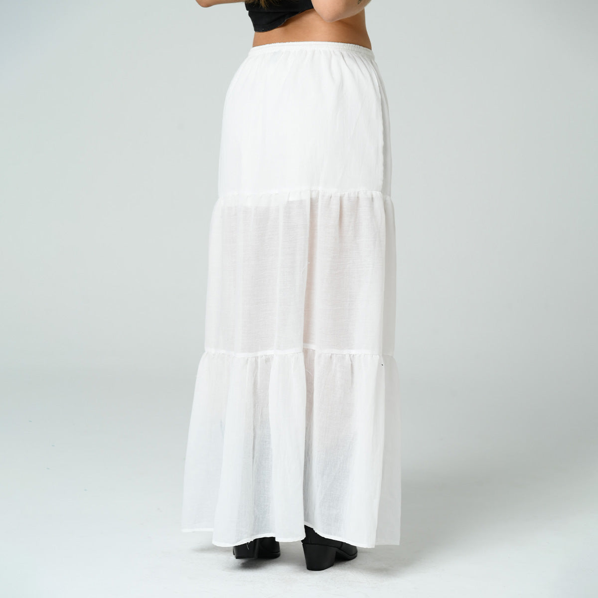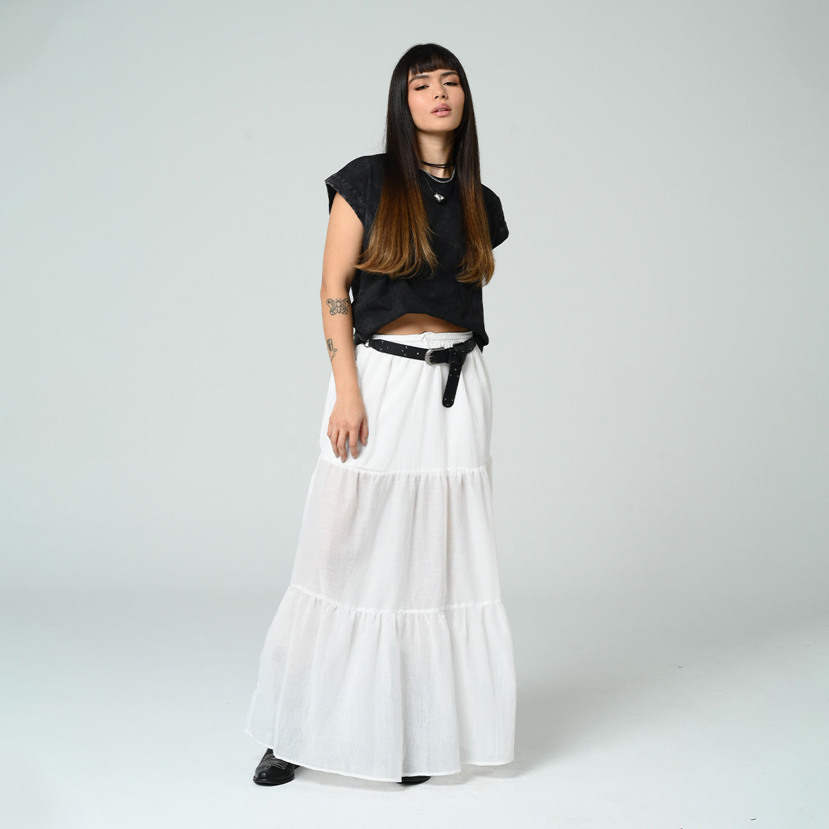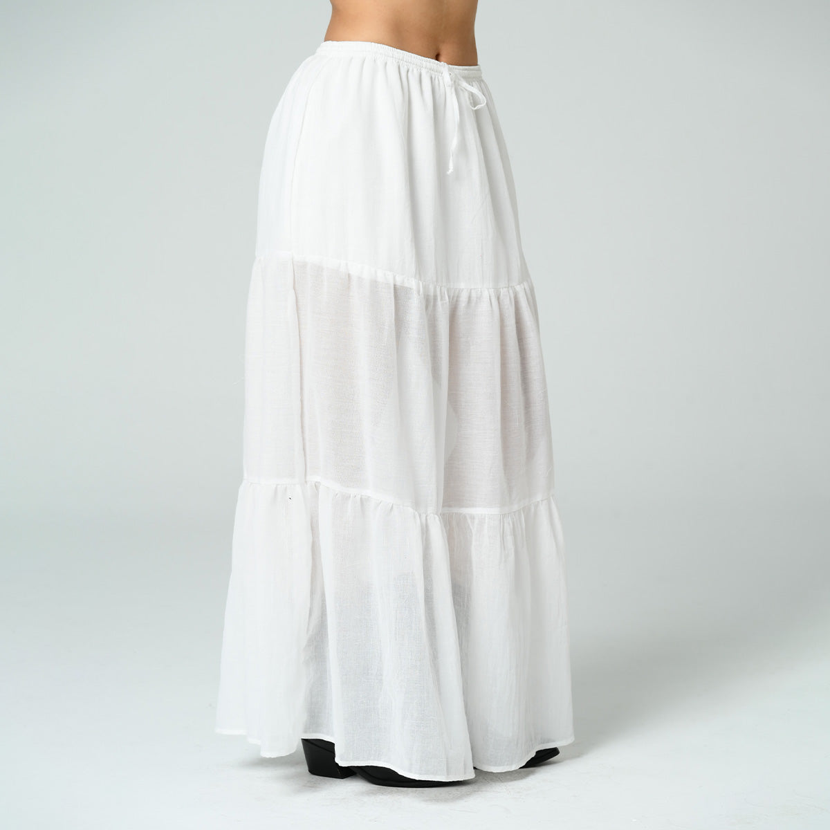 -Falda larga de boleros -silueta amplia -talle medio -cintura con elástico y amarre -tejido plano color ivory