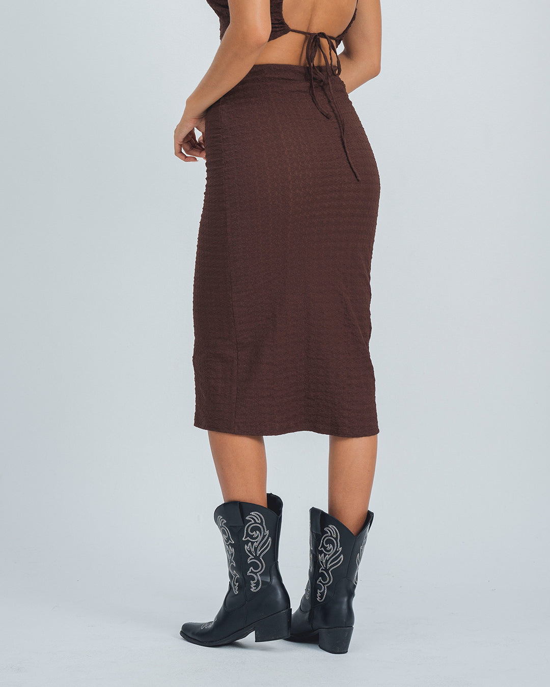 Falda midi talle alto con aberturas en los lados, elaborada en un tejido con elongación con textura, color café. La modelo usa talla 8.