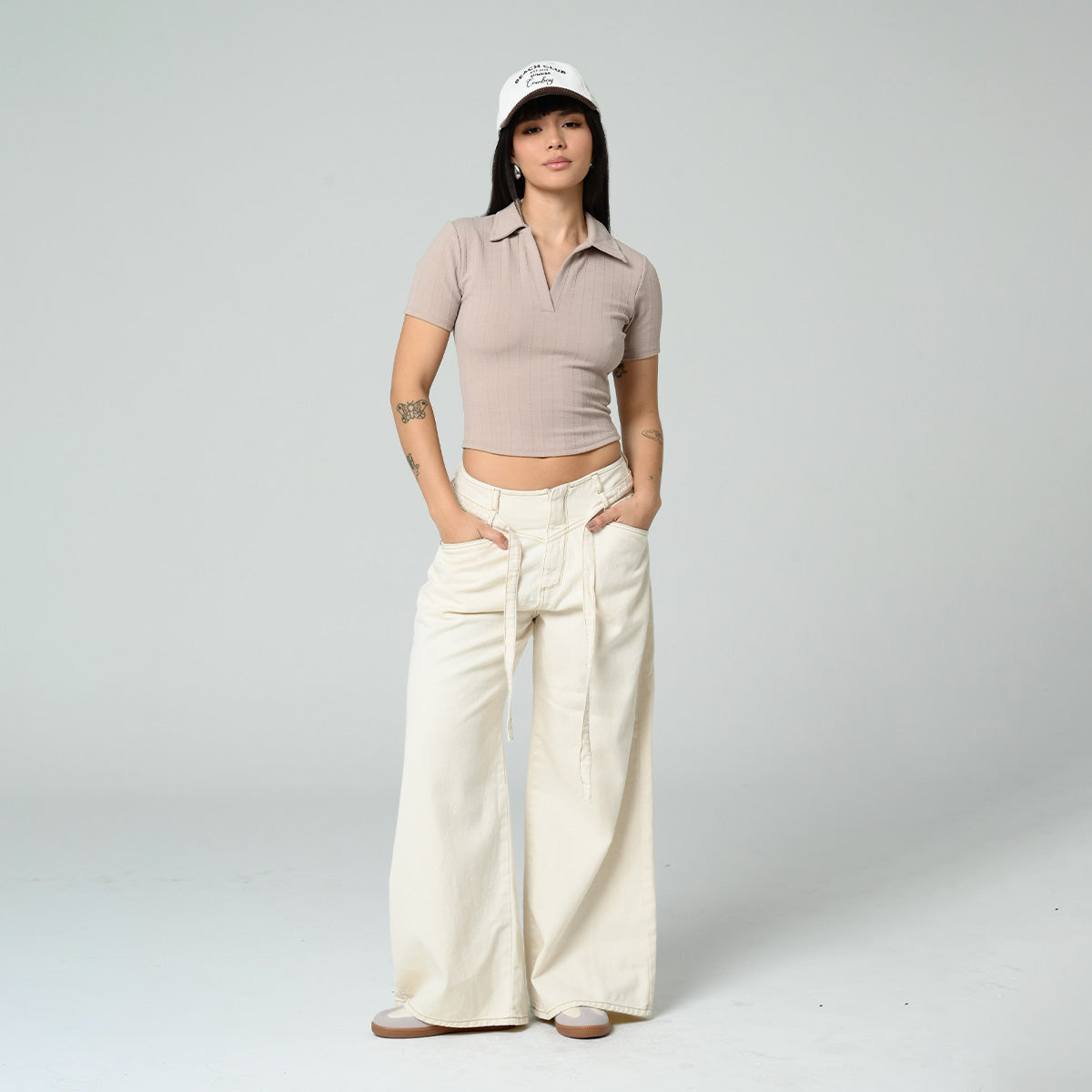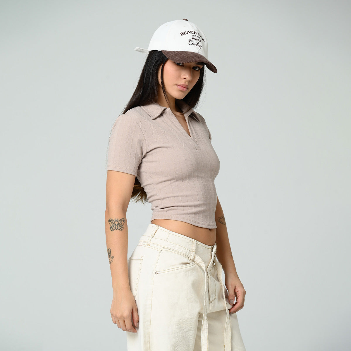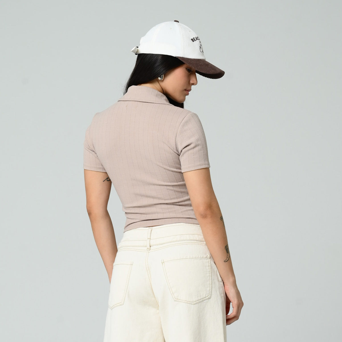 -Blusa manga corta tipo polo -silueta ajustada -cuello y escote en V -largo medio -tejido de punto -color caqui