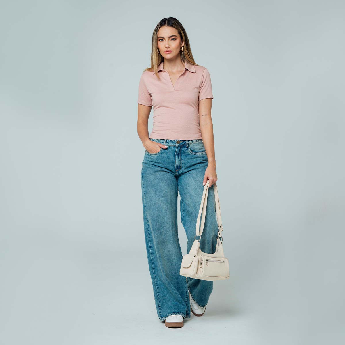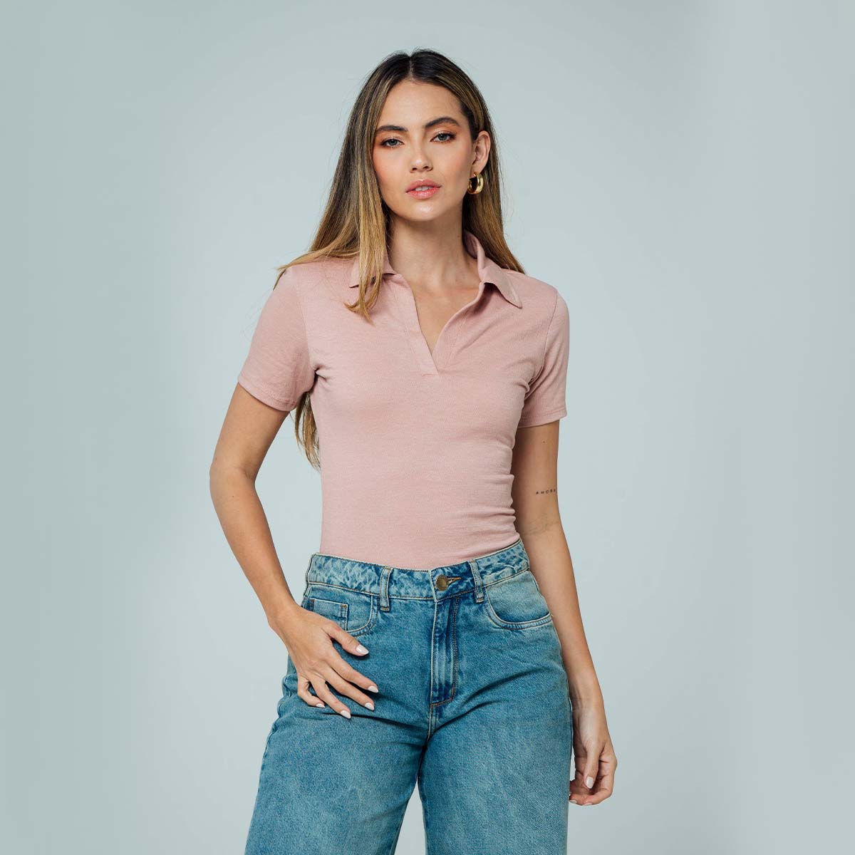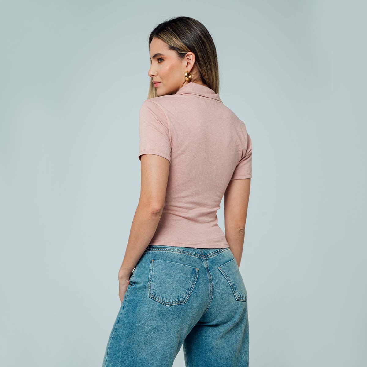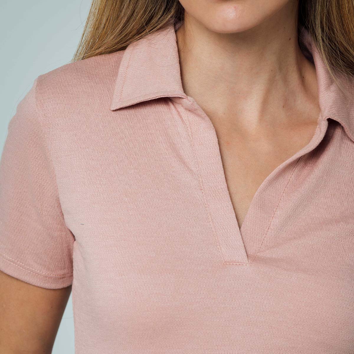 -Blusa tipo polo -silueta ajustada -cuello y escote en V -largo medio -tejido de punto con textura -color rosado