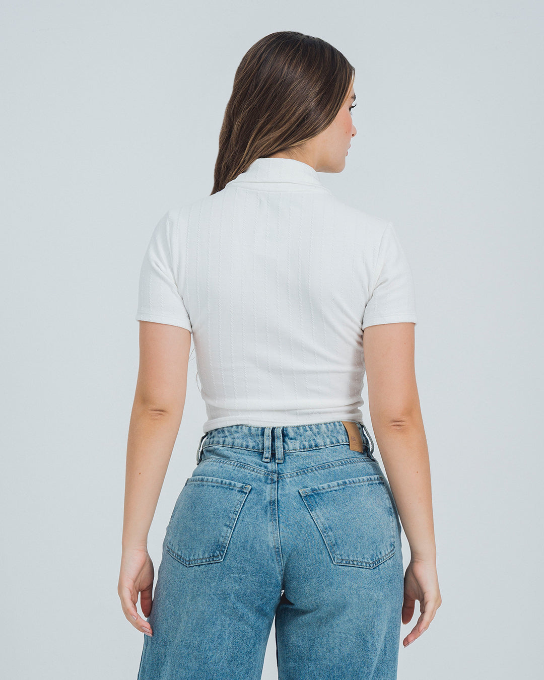 -Blusa manga corta tipo polo -silueta ajustada -cuello y escote en V -largo medio -tejido de punto -color ivory
