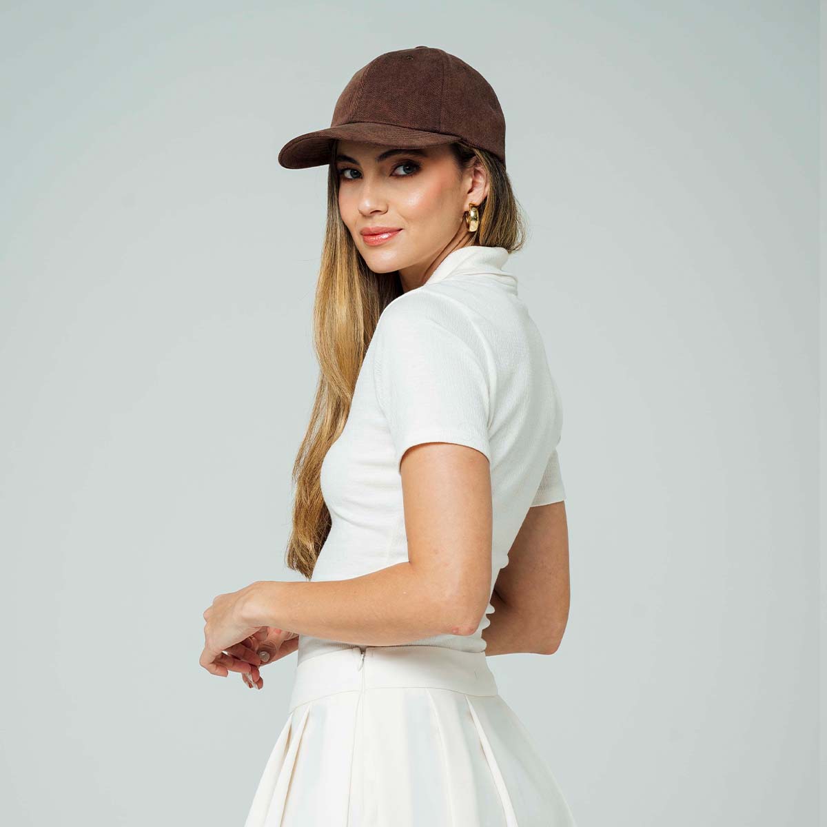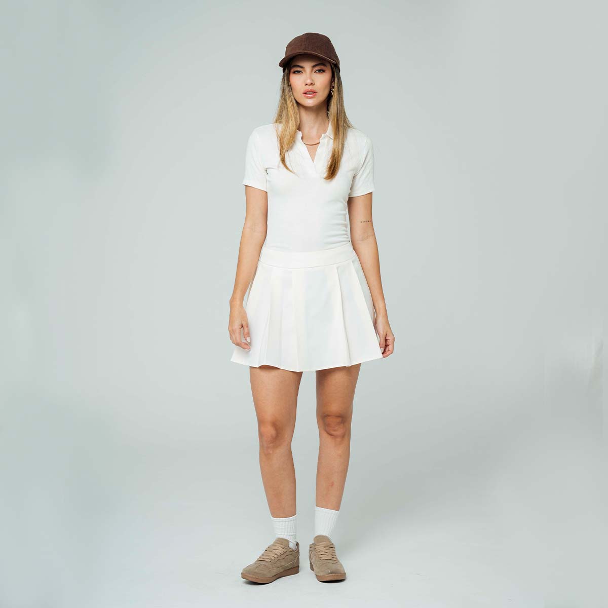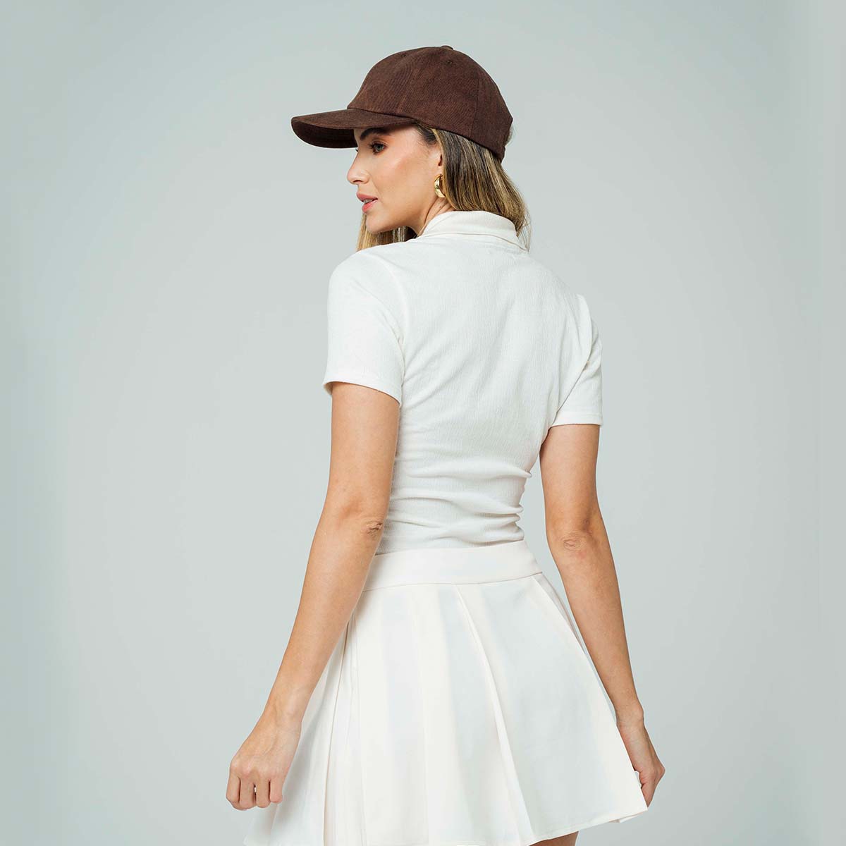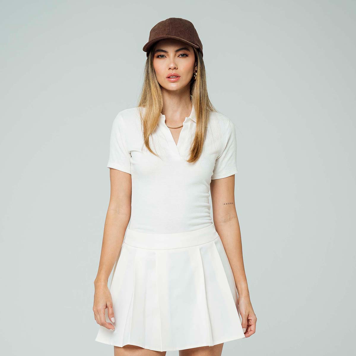 Polo manga corta ajustada, elaborada en tejido plano con elongación y textura color marfil. La modelo usa talla s.