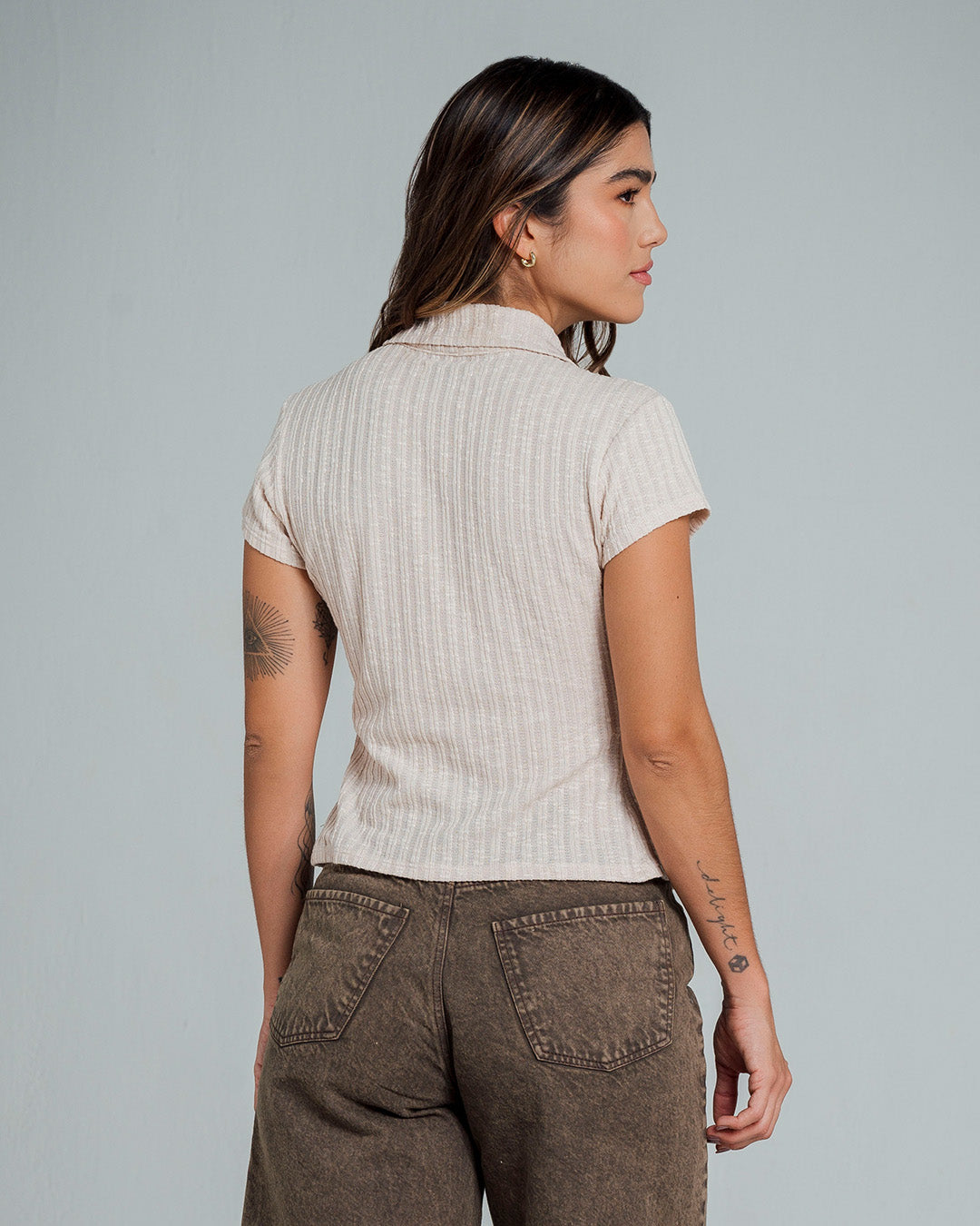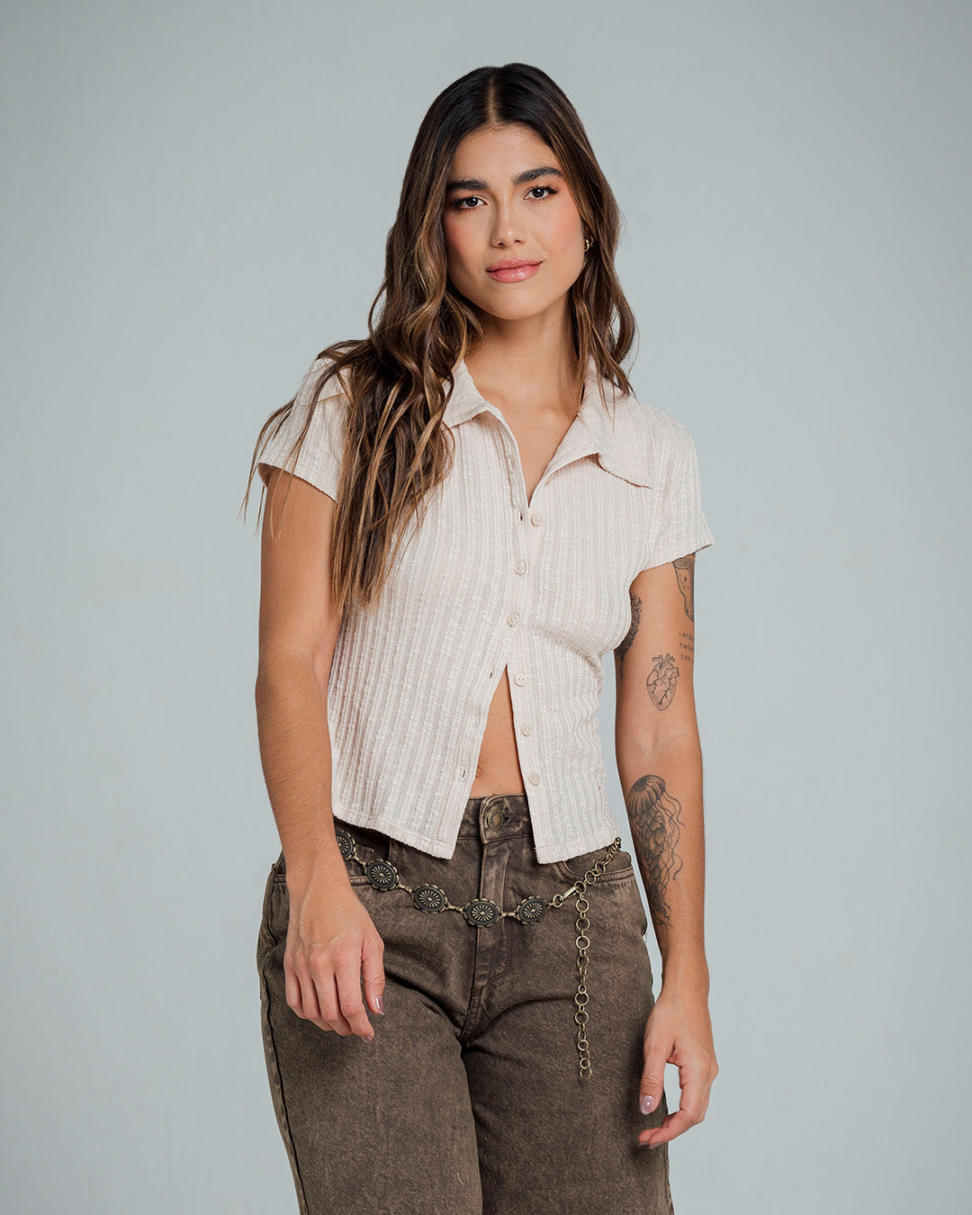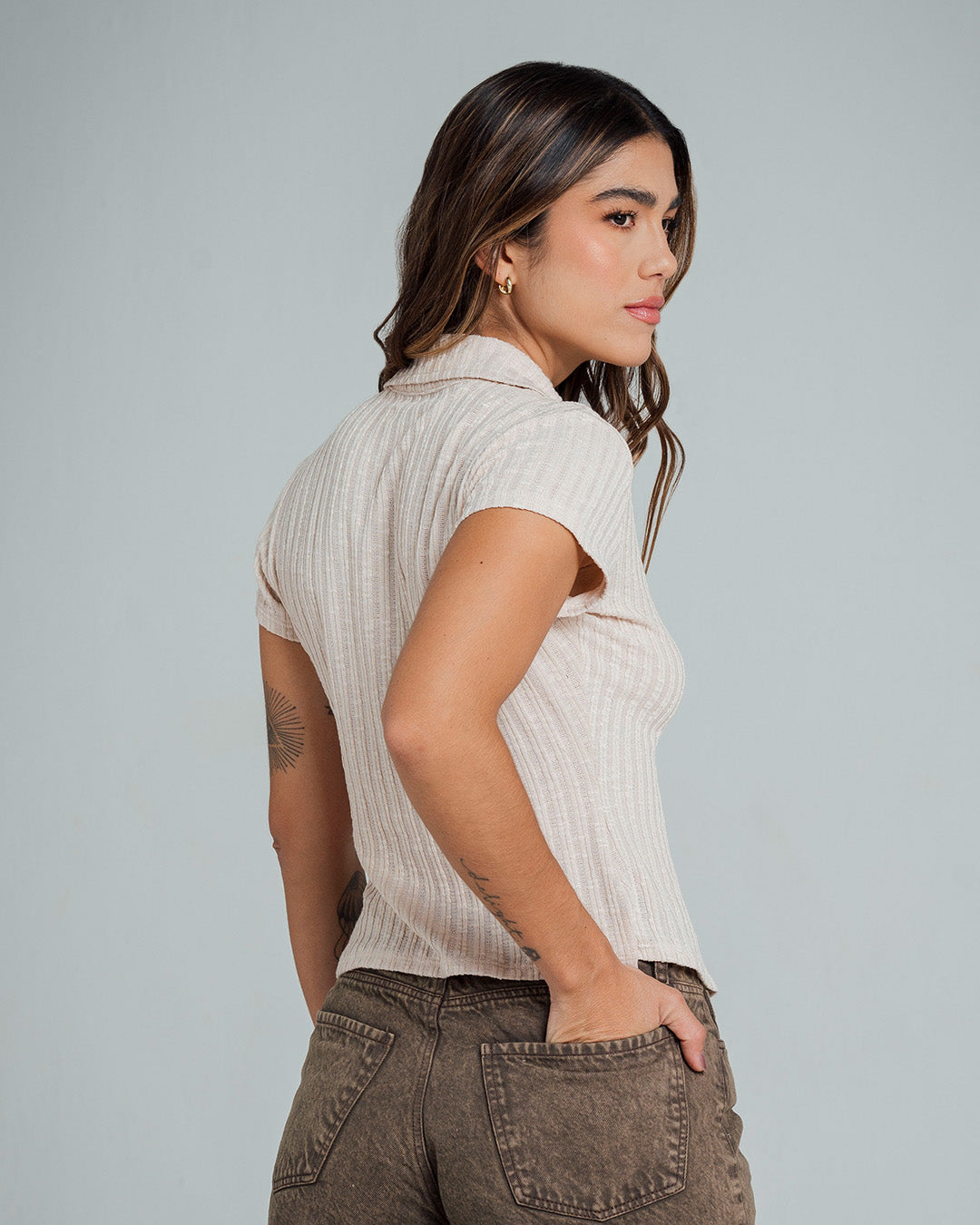 -Blusa Tipo Polo -Silueta Ajustada -Largo Medio -Frente Con Perilla Y Botones -Tejido De Punto Tipo Lanilla -Color Arena