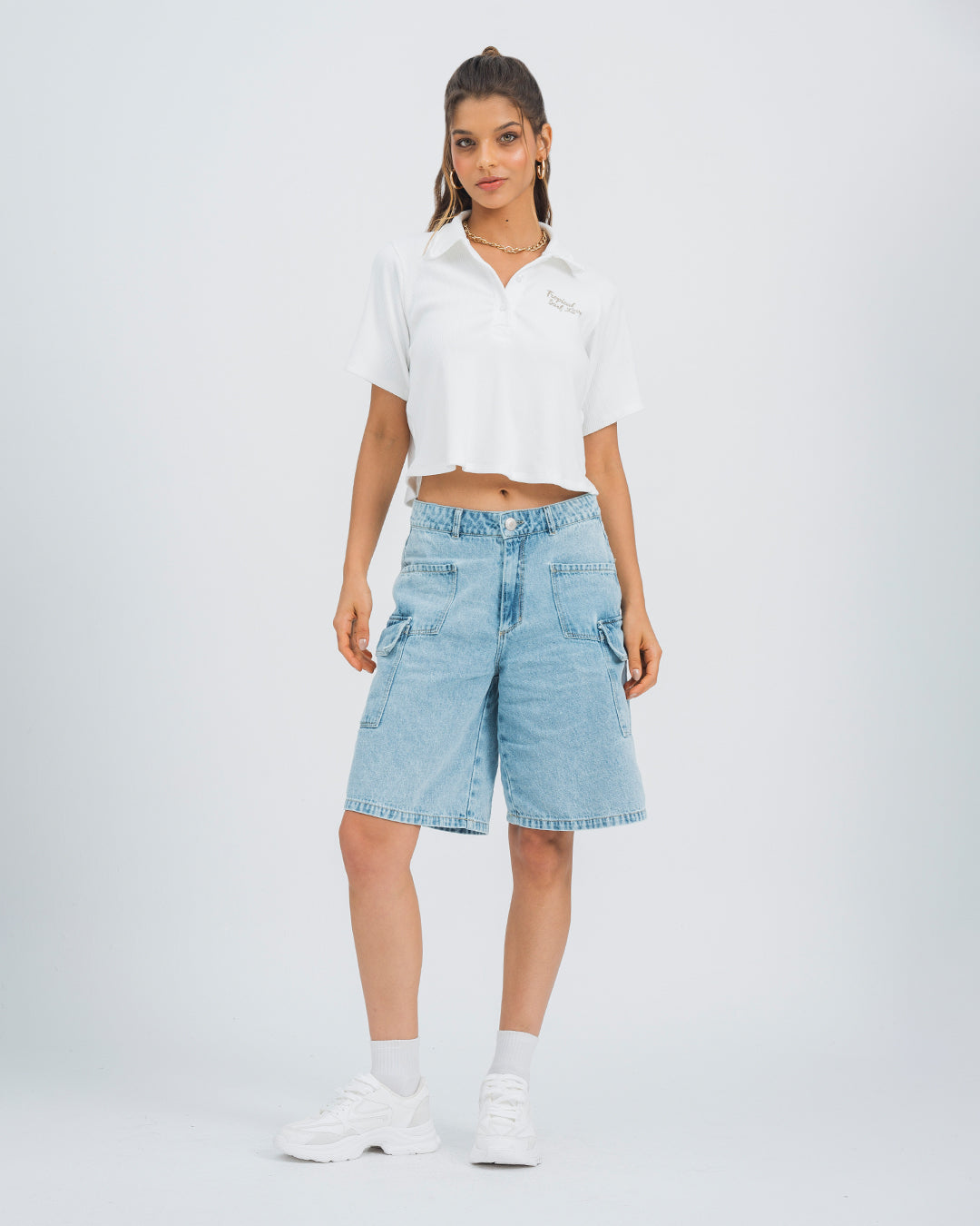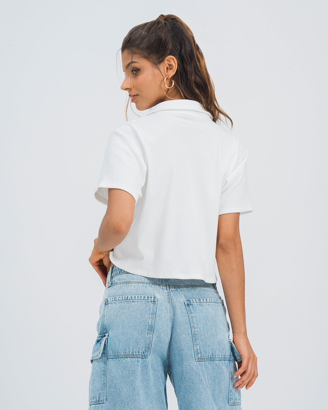 Camiseta polo en rib poliéster spandex para mujer Ropa casual de moda en Colombia Esta camiseta polo de silueta amplia está confeccionada en rib de poliéster y spandex, lo que le aporta elasticidad y comodidad para el uso diario. En elegante color marfil, cuenta con un estampado tipográfico de punto corazón que añade un detalle moderno y distintivo a la prenda. Su diseño con cuello tipo polo y manga corta la convierte en una opción versátil para diferentes ocasiones desde el día a día, hasta una salida con amigas, la oficina o la universidad. Ideal para quienes buscan un look casual pero cuidado, esta prenda es un básico actualizado dentro de la ropa de moda en Colombia, perfecta para combinar con jeans, faldas o pantalones casuales.