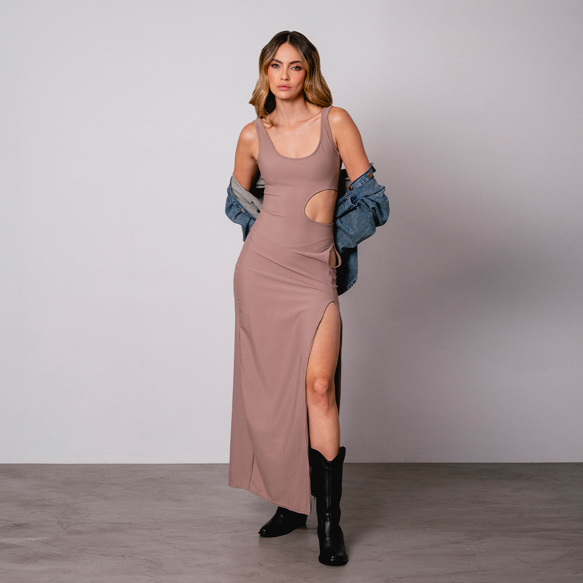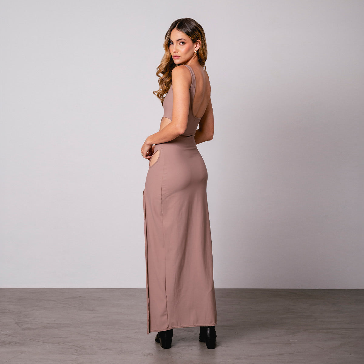 -Vestido Largo Manga Sisa -Silueta Ajustada -Escote Redondo -Espalda Con Escote Pronunciado -Aberturas En Frente -Tejido De Punto -Color cafe