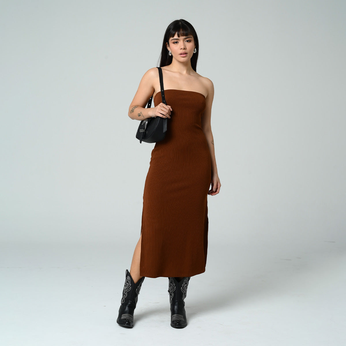 -Vestido largo strapless -Silueta ajustada -Abertura en laterales -Tejido de punto Rib -Color cafe
