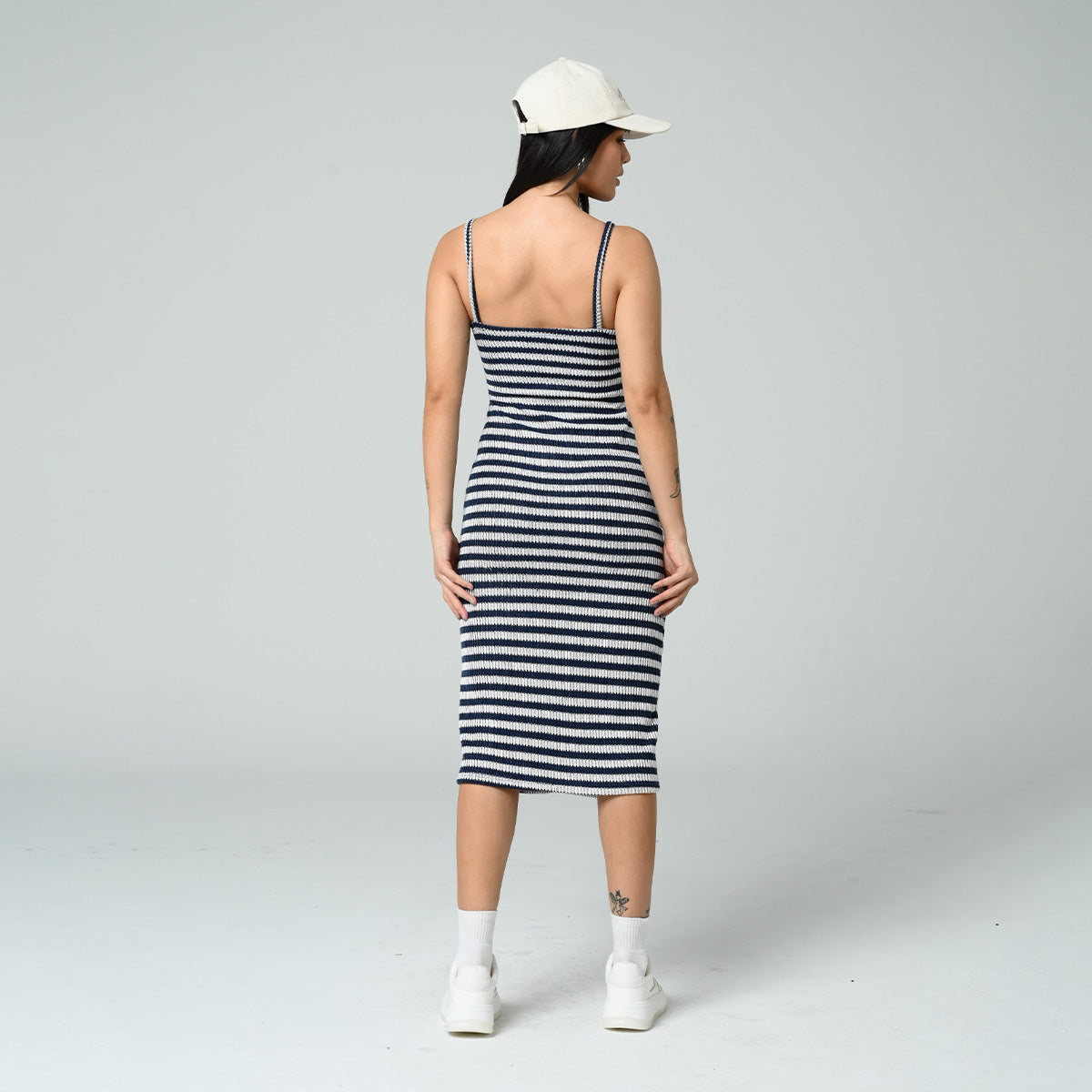 -Vestido de tiras -silueta ajustada -largo midi -tejido de punto tipo lanilla en rayas ivory x azul -color ivory