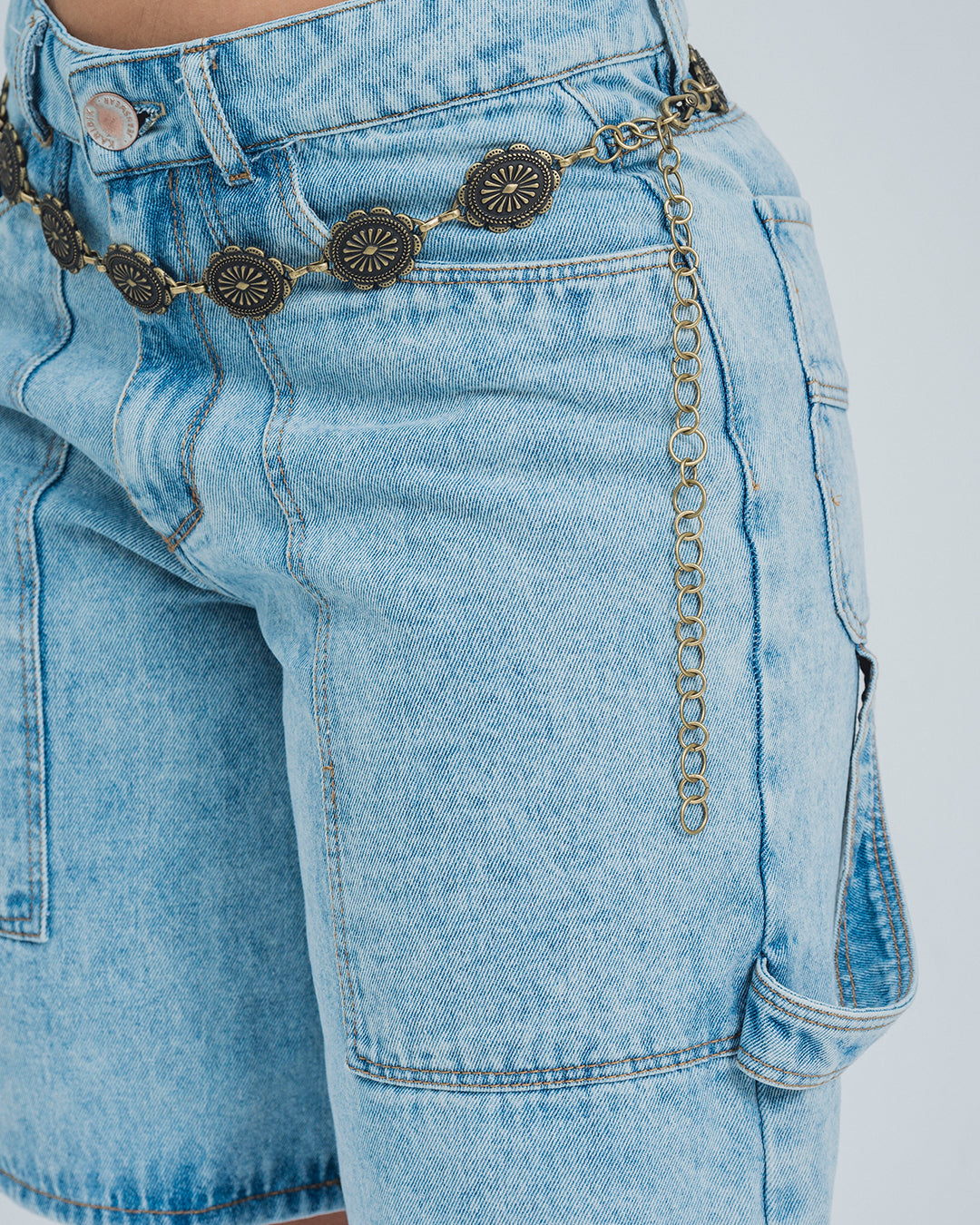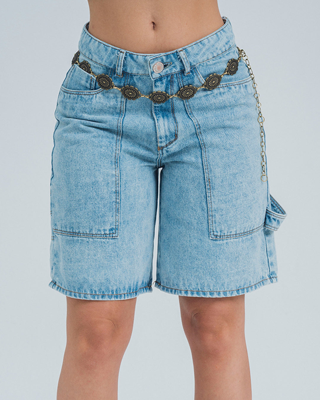 Bermuda talle medio, bolsillos tipo parche en frente, bolsillo carpintero en el posterior, denim con proceso en lavandería, color azul. La modelo usa talla 8. turin