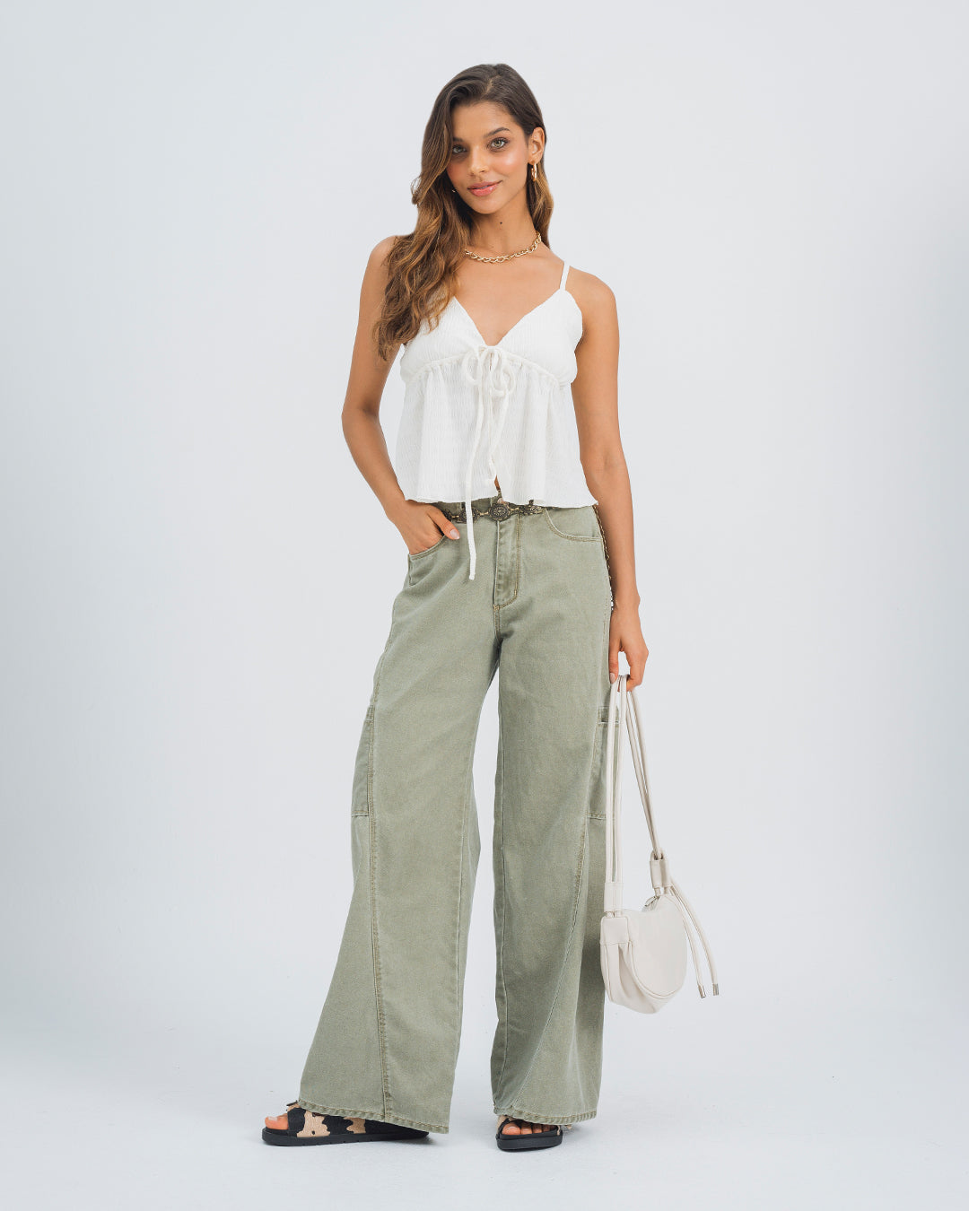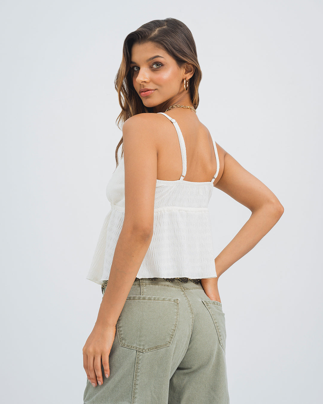 Blusa boho en tejido de punto poliéster con textura Ropa fresca, cómoda y ligera en Colombia Esta blusa semi amplia de tiras combina la frescura del estilo boho con la delicadeza de un diseño versátil. Confeccionada en tejido de punto de poliéster con textura, en un elegante color marfil, ofrece un acabado ligero y femenino ideal para climas cálidos. Su escote en V está realzado con volantes y tiras de amarre graduables que aportan un toque romántico y moderno al mismo tiempo. El frente abierto con volantes le da dinamismo y movimiento, convirtiéndola en una prenda perfecta para el día a día. Su diseño transmite frescura, ligereza y comodidad, cualidades que la hacen imprescindible dentro de la ropa fresca, cómoda y ligera de la moda colombiana. Una opción ideal para quienes buscan un look natural y lleno de estilo.