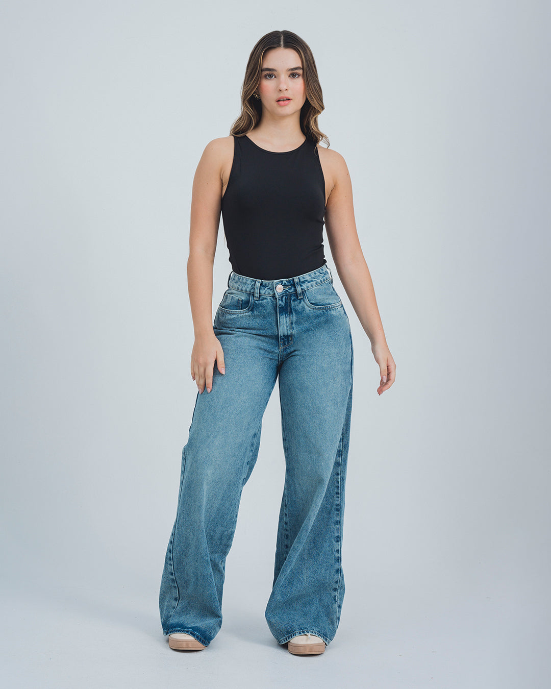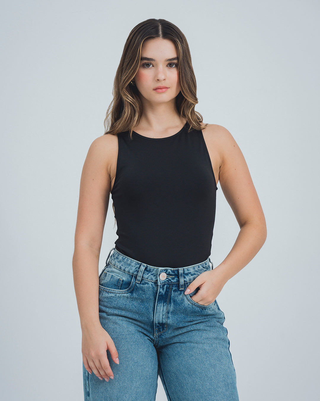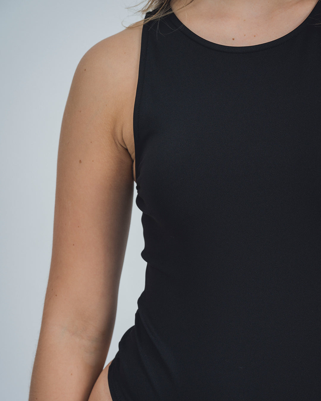 Body básico manga sisa, cuello alto, elaborado en tela deportiva con elongación, color negro. La modelo usa talla s.