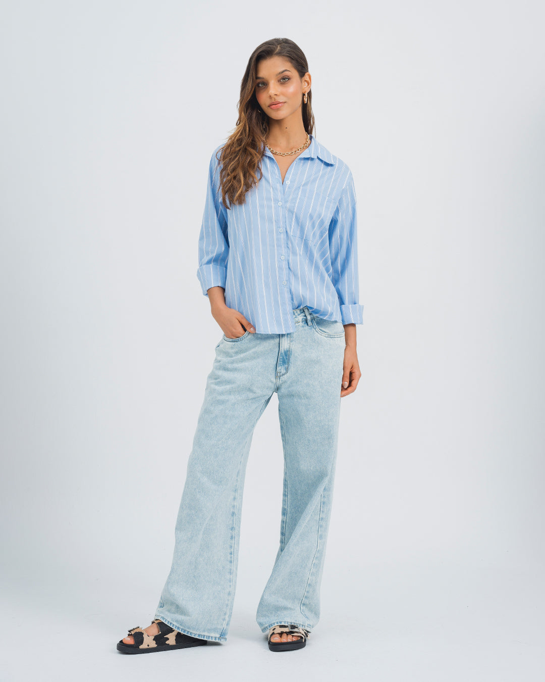 Blusa en algodón, poliéster y elastano con un diseño casual y cómodo. En color azul con delicadas rayas, con manga larga y botones en el frente, esta prenda es fresca y versátil, ideal para el día a día, la oficina o una salida con amigas. Su estilo relajado y funcional la convierte en una prenda indispensable para quienes buscan comodidad sin perder elegancia.