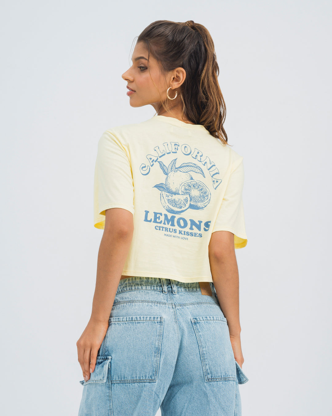 Camiseta amplia corta confeccionada en algodón, perfecta para un look casual y relajado. En un suave tono amarillo claro, cuenta con cuello redondo y manga corta que aportan frescura y comodidad. Su diseño incluye estampado en el frente y la espalda, lo que añade un toque moderno y versátil. Gracias a su material liviano, brinda una sensación de frescura ideal para el día a día, convirtiéndose en un básico de tu armario que combina con todo y nunca pasa de moda.