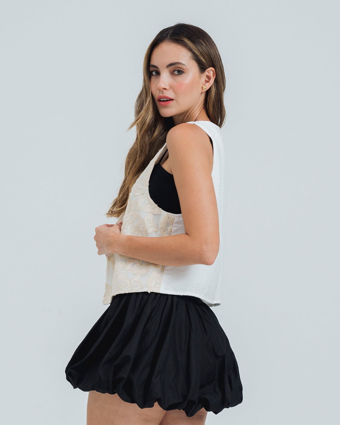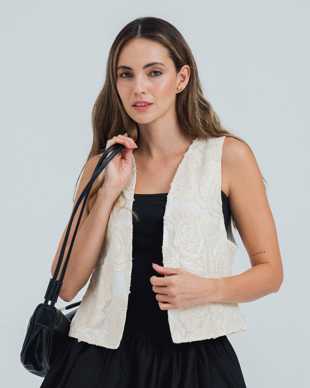 Dale un toque femenino y bohemio a tu look con este chaleco tipo crochet color marfil, confeccionado en tejido plano 100 poliéster con diseño floral bordado. Su textura liviana y su silueta semi amplia aportan comodidad y movimiento, creando un estilo natural, fresco y lleno de encanto. El diseño tipo crochet con detalles florales realza su aire romántico y artesanal, ideal para combinar con blusas ligeras, jeans o vestidos. Su tono marfil lo convierte en una prenda versátil que complementa cualquier outfit con elegancia y delicadeza. Perfecto para brunch, viajes o días veraniegos, este chaleco es una prenda esencial para quienes buscan una silueta en tendencia, cómoda y con personalidad.