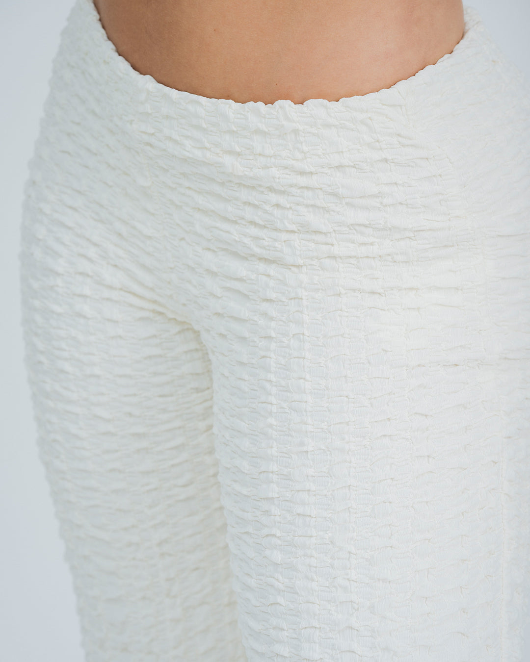 Pantalón talle medio, ajustado en la cadera, bota amplia con aberturas, elástico en cintura, tejido con elongación con textura, color marfil. La modelo usa talla 8.
