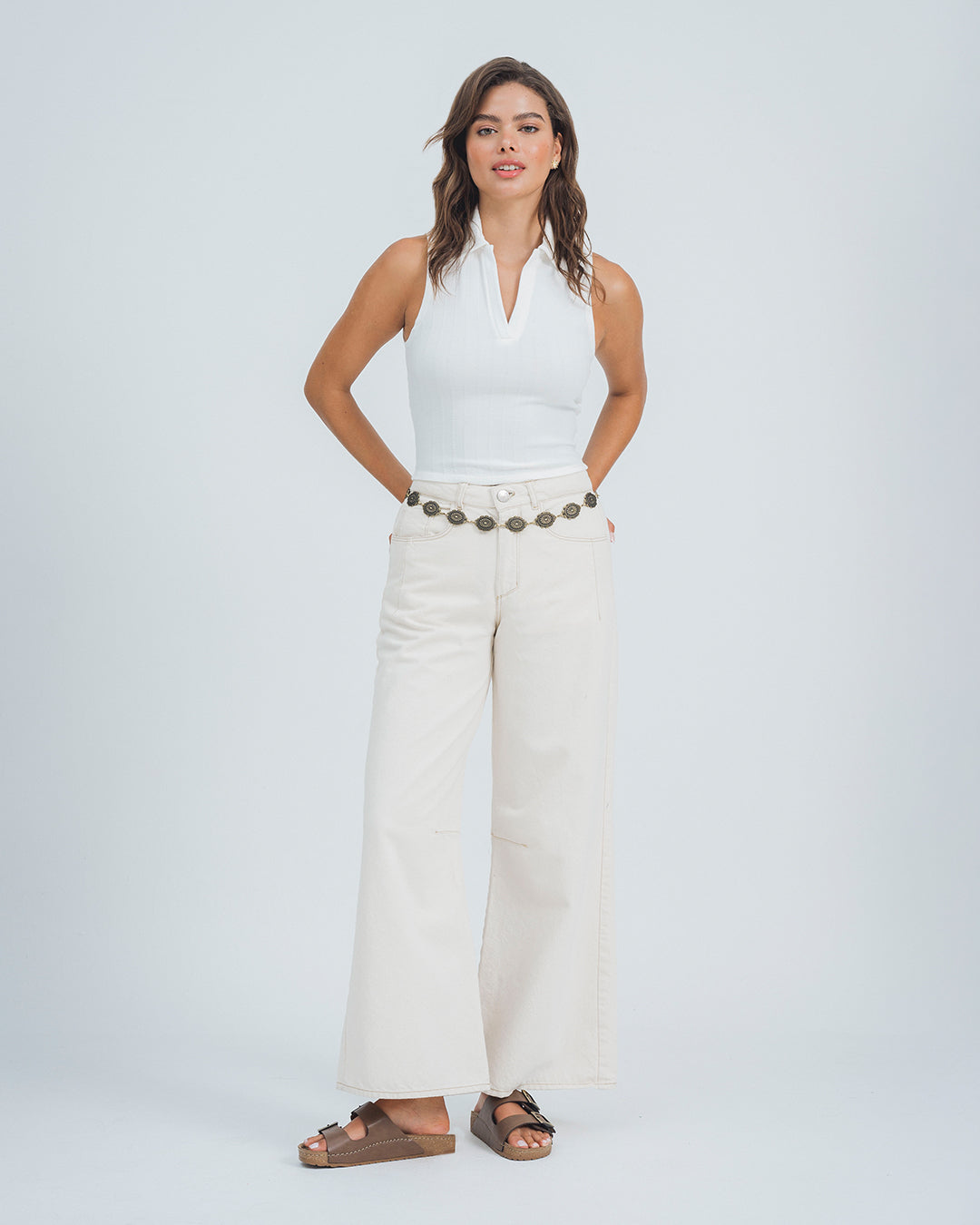 Polo ajustada manga sisa, en tejido con elongación, color marfil. La modelo usa talla s.